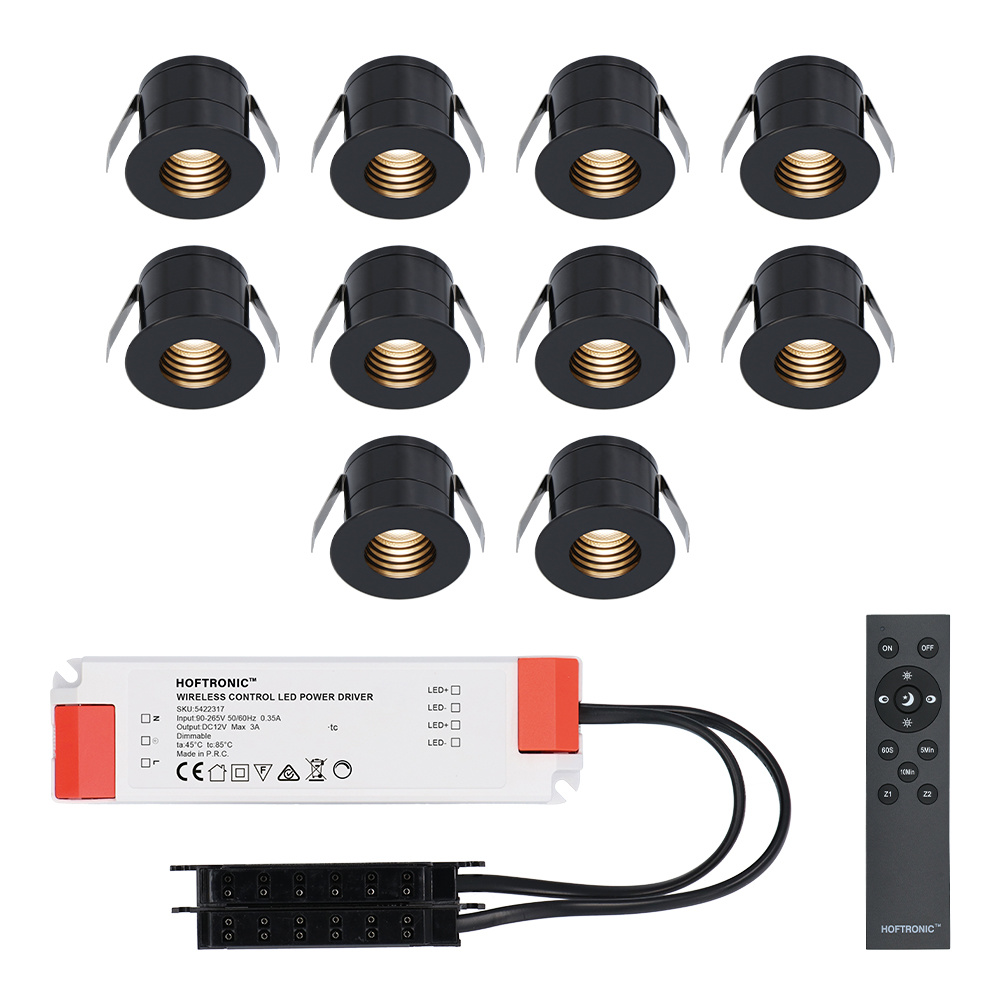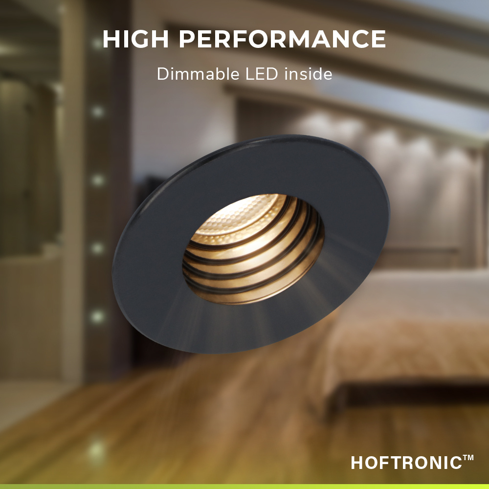 De Hoftronic Betty dimbare inbouwspot zijn traploos dimbaar, wat betekent dat je in een vloeiende overgang van 100% naar 0% kunt dimmen, en omgekeerd. De kleurtemperatuur is 2700K, wat staat voor warm wit licht. Er wordt een afstandsbediening bij bezorgd. Zit je uniek in je luie stoel op de veranda, of lig je languit in bad en denk je: de verlichting staat toch iets te fel? Met de afstandsbediening dim je de verlichting rechtstreeks, en hoef je dus niet op te staan. Ideaal.