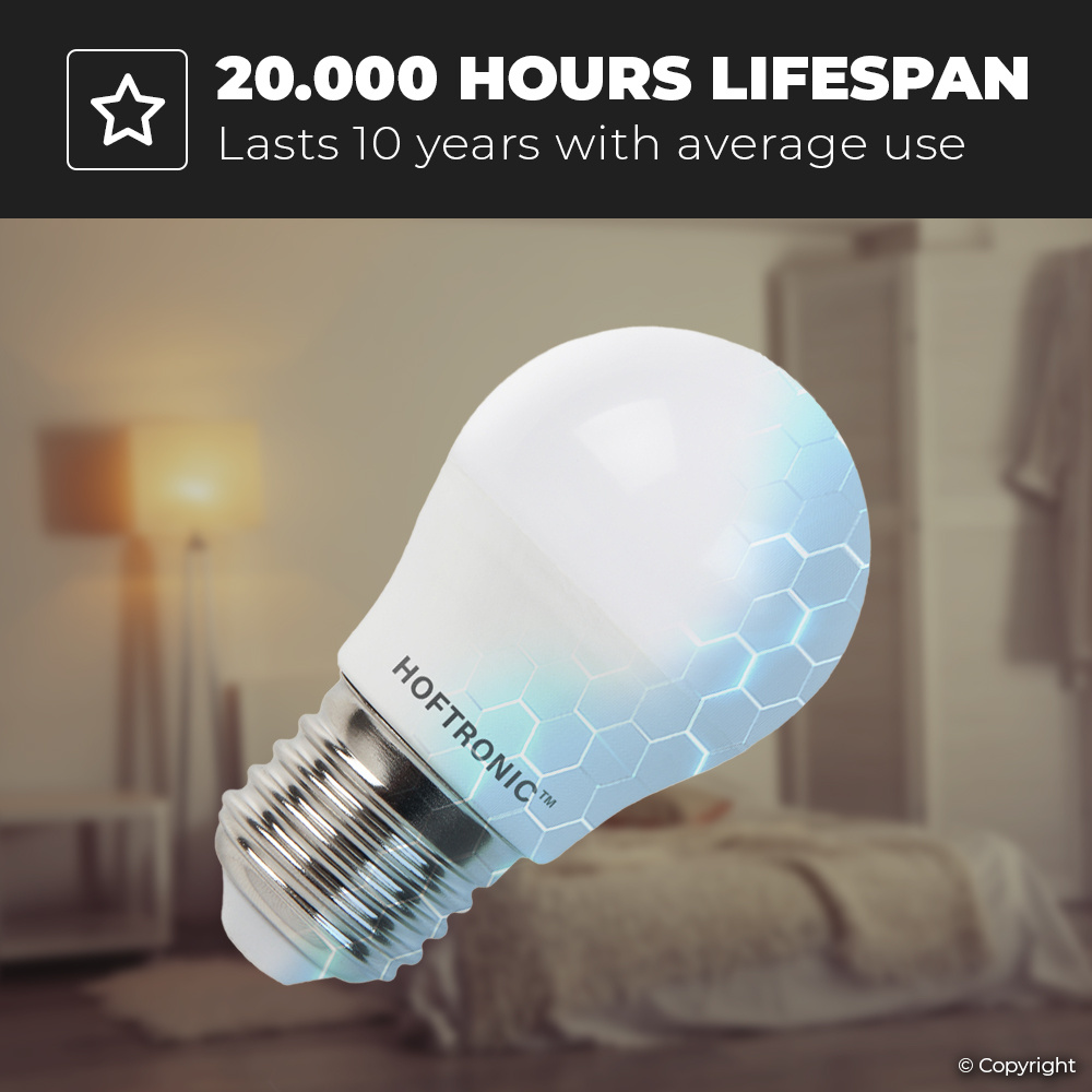 Deze E27 LED lamp is van het merk HOFTRONIC. HOFTRONIC is zowel fabrikant als verkoper van LED verlichting. Hierdoor profiteer je van de scherpste prijs, de hoogste kaliber en de belangrijkste garantievoorwaarden. Op deze E27 LED lamp ontvang je dan ook 2 jaar garantie. Defecten in huis deze 2 jaar worden ideaal voor niets verwisselen.