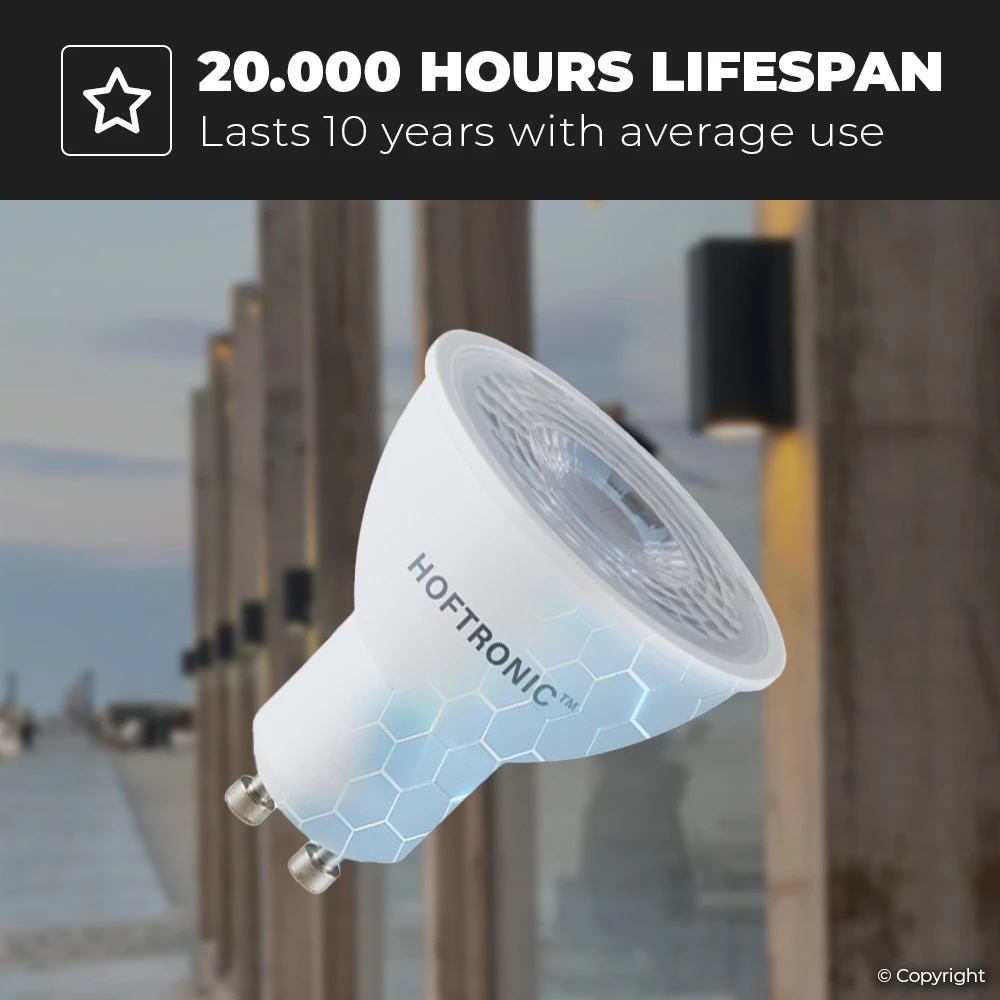 Snel, simpel en daadwerkelijk besparen op energiekosten doe je met deze GU10 spot van HOFTRONIC. Met de LED spot kun je je huidige halogeenlampen, gloeilampen of LED lampen 1 op 1 variëren. Met een verbruik van slechts 4,5 Watt en een lichtopbrengst van 345 lumen vervangt deze LED spot een halogeenlamp van 50 Watt. Een besparing van 85% op je energiekosten. De LED spot schijnt een daglicht wit licht van 6500 graden kelvin. De ideale lichtkleur voor het verlichten van nuttige vertrekken, bijv. de badkamer, gang of keuken.