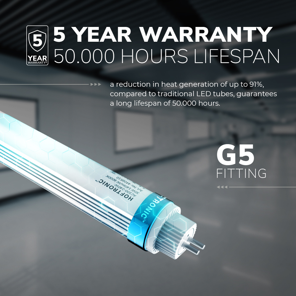 Door de additionele veilige overspanningsbeveiliging gaan de buizen nooit meer defect bij het aan- en uitzetten of overspanning. Door het behoorlijke aluminium kan de TL LED buis maar liefst 91% beter zijn warmte kwijt dan een plastic buis, hierdoor zullen de interne componenten continu top prestaties leveren. De driver zit veilig geïsoleerd in de eindkap van de TL buis, dit zorgt ervoor dat de hitteproductie van de driver geen invloed kan hebben op de LED chips in de buis. Met andere woorden, de geïsoleerde vervaardiging van de driver zorgt ervoor dat de LED chips niet kunnen verbranden door de hitte vanuit de driver. De TL buis is afgewerkt met een hoogwaardige poedercoating die ervoor zorgt dat de buis niet gaat roesten, verkleuren, stootbestendig én ideaal krasvrij is. De extra veilige LED TL balken zorgen voor meerdere jaren lang lol, op deze LED buis ontvang je maar liefst 5 jaar garantie.