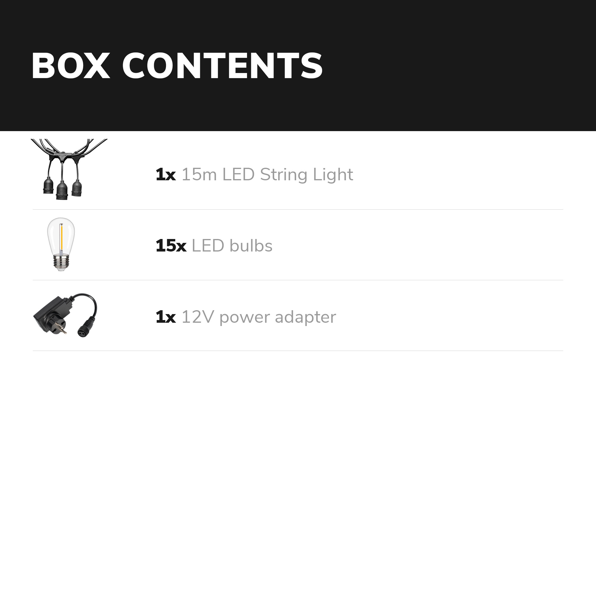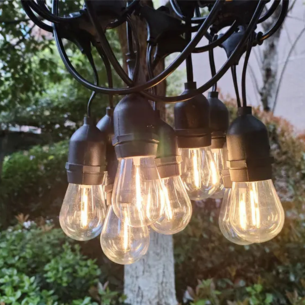 Elke tuin wordt gezelliger met een gemoedelijke string light set. Het lichtsnoer is gemakkelijk op te hangen en zorgt meteen voor een gezellige sfeer in de tuin. Deze string light bestaat uit 15 E27 fittingen met bijpassende lampjes. De kabel van de string light is gebouwd uit zware kwaliteit rubber (H05VV-F 2X1.0mm²). Gaat er een lampje stuk of wil je andere lampjes in de prikkabel draaien? Dat kan, ze lampjes zijn moeiteloos te vervangen. De afstand tussen de lampen is 1 meter, de lengte vanaf de stekker tot de eerste lamp is 0,7 meter.