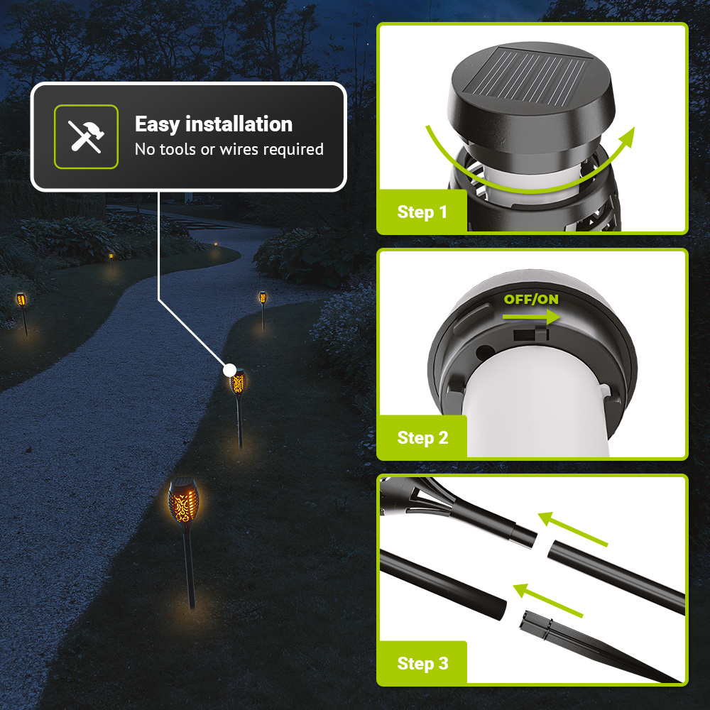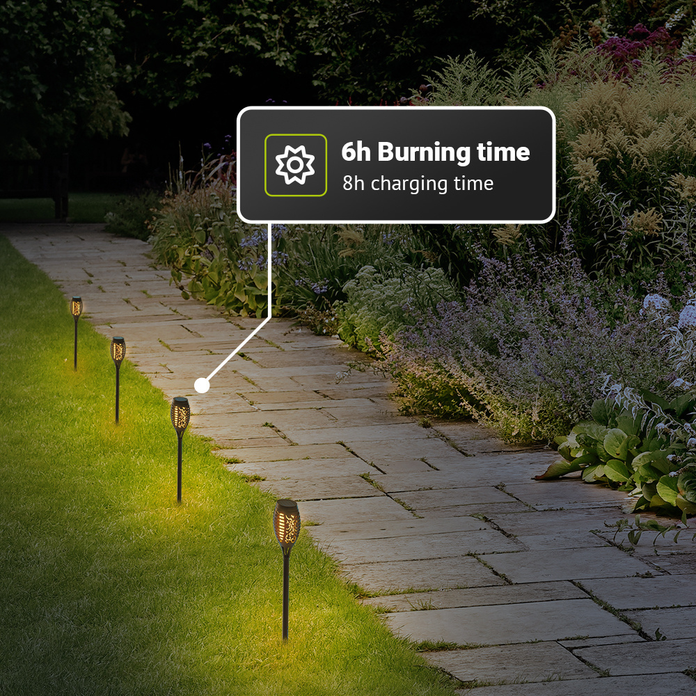 Deze LED solarlamp tuinfakkels worden opgeladen op basis van zonne-energie, die wordt opgenomen door de zonnepanelen bovenop de tuinfakkels. Deze solar led tuinfakkels worden bezorgd met een grondspies waardoor je de lampen bijna overal kunt ruimtes. Totale dimensies zijn 75 x 75 x 500 millimeter. Door de geïntegreerde schemersensor gaat de fakkel zelf aan zodra er schemering wordt gedetecteerd.