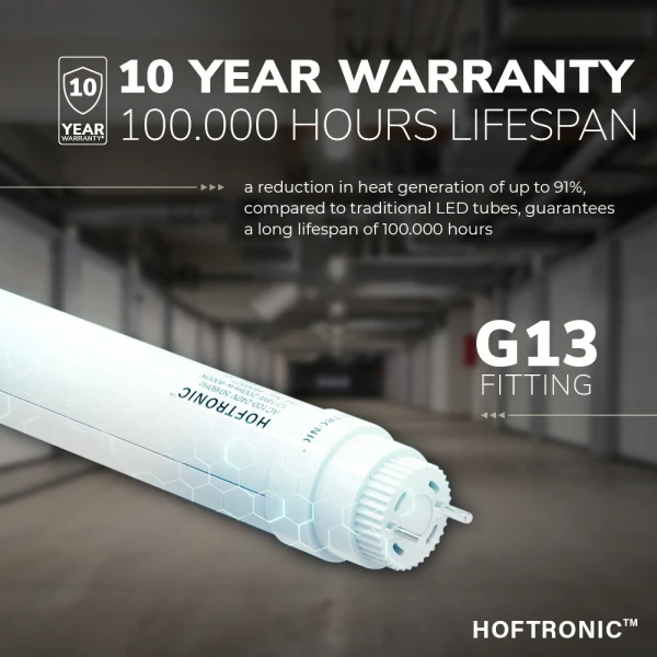 Van deze LED TL buis heb je 100.000 branduren amusement. Wanneer je de buis 250 dagen per jaar aan hebt staan, tijdens 10 uur per dag komt dit neer op 40 jaar. Dankzij de hoogwaardige componenten zal deze LED buis tijdens deze 40 jaar top prestaties leveren. Zo neemt de lichtkleur slechts met 10 procent af tegen het einde van zijn levensduur (L90B50 LB-factor). Op deze LED buis ontvang je maar liefst 10 jaar waarborg.