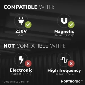 Door de meegeleverde dummy starter kun je deze LED TL buis ogenblikkelijk aansluiten op een traditioneel T8 armatuur. Bij het aansluiten van de TL LED buis op een Hoftronic armatuur heb je géén dummy starter meer nodig. Je hebt hier meerdere installatiemogelijkheden voor. Deze hebben we uitgelegd in onze blog: TL Verlichting verwisselen voor LED buizen.