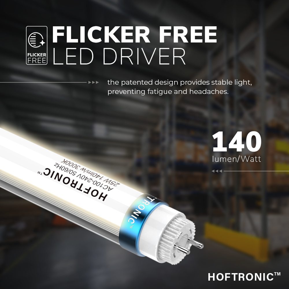 Door de unieke interne samenstelling en hoogwaardige componenten is deze buis flikkervrij. Dit is zeer belangrijk bij de overstap naar LED. Traditionele TL verlichting en normaal LED TL buizen zijn niet flikkervrij en werken op 50-60 Hertz. Dit betekent dat het licht 50 tot 60 keer per seconde knippert waarbij onze hersenen merken dat het geen stabiel licht is. Onbewust moeten de hersenen dit aanhoudend bijstellen waardoor klachten kunnen ontstaan van moeheid en hoofdpijn.