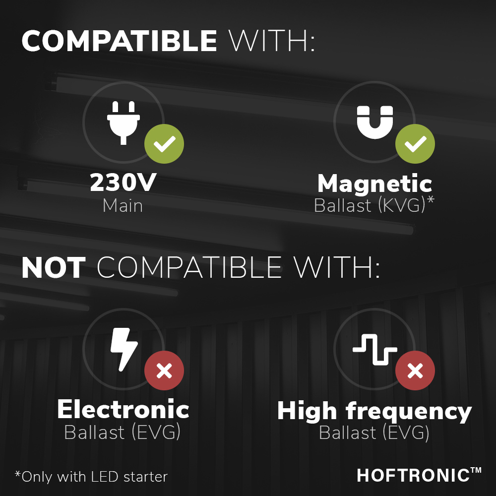 Deze LED buis is goed voor gebruik in een bestaand armatuur welke uitgevoerd is met een magnetisch voorschakelapparaat. Wanneer dit het geval is dien je de oude starter te verwisselen door de meegeleverde LED starter. Tevens is de LED buis bekwaam voor armaturen, welke direct op het 230V lichtnet worden aangesloten. De LED buis is niet geschikt wanneer je bestaande armatuur een elektronisch of hoog genoeg voorschakelapparaat heeft. Wanneer je bestaande armatuur wel een elektronisch of hoog veelvuldig voorschakelapparaat heeft, en je wilt een led buis hier op aansluiten, dan dien je deze te verwijderden en het armatuur ogenblikkelijk op 230V aan te sluiten.