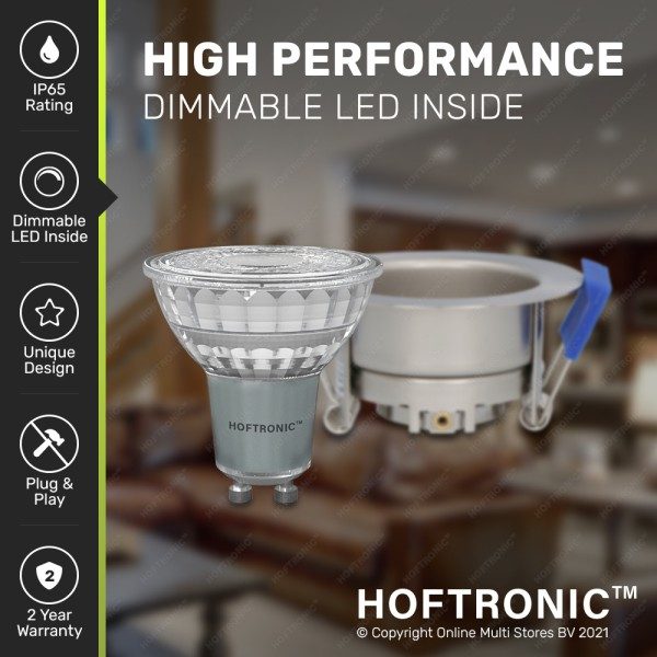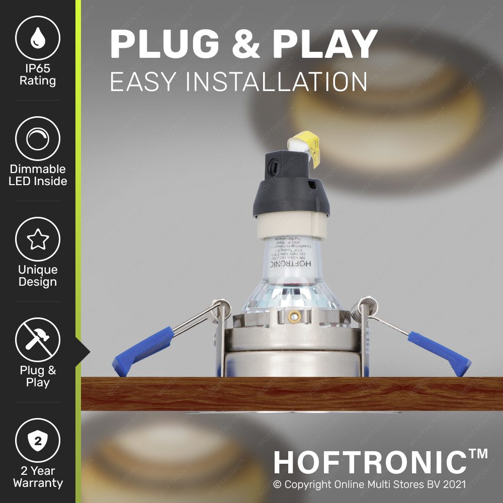 De Mari LED inbouw spot is makkelijk te installeren door het plug & play systeem dat aan de spot bevestigd zit, dit systeem bestaat uit een GU10 fitting en een aansluitdoos. Sluit de spot thuis een handomdraai aan op het lichtnet en installeer de meegeleverde GU10 lichtbron in de GU10 fitting. Deze inbouwspot wordt ogenblikkelijk aangesloten op het 230V lichtnet waardoor je geen trafo hoeft weg te werken.