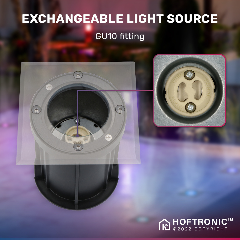 De lichtbron in het armatuur is vervangbaar met een GU10 LED lamp. Meegeleverd is een Hoftronic Smart smart LED spot RGBWW van 5,5 Watt per spot.