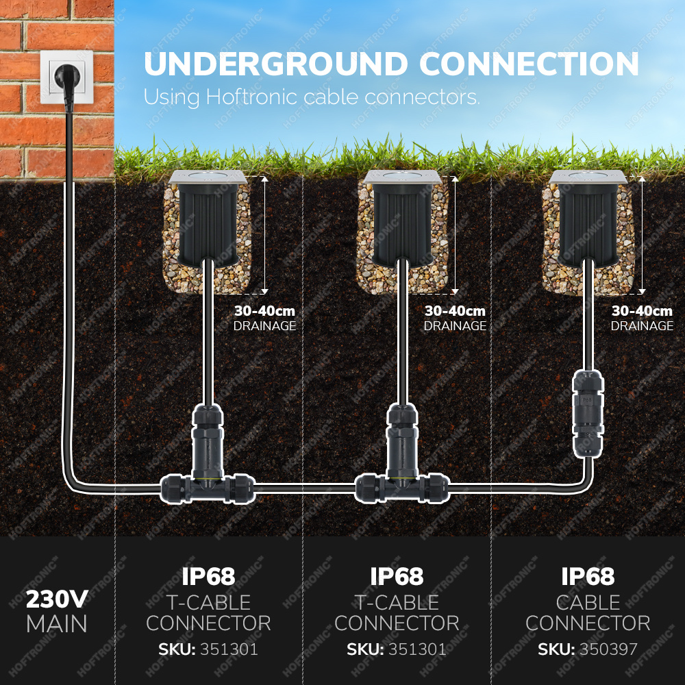Je hoeft enkel door middel van de waterdichte kabelverbinder de grondspots te koppelen aan de stroomkabel van de netvoeding. Hiervoor heb je geen transformator voor nodig. Het aansluiten van de tuinspots is nu een fluitje van een cent! (Let op deze zijn niet inbegrepen)