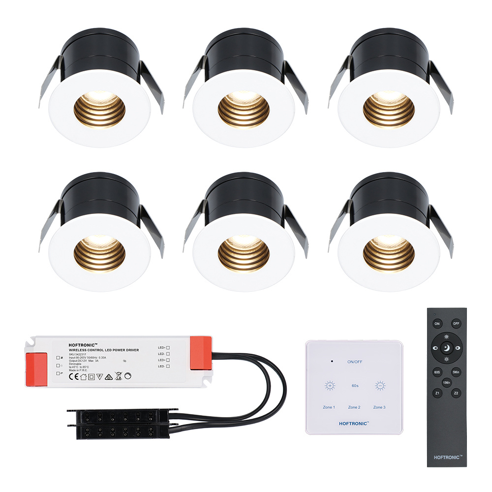 De Hoftronic Betty dimbare inbouwspot zijn traploos dimbaar, wat betekent dat je in een vloeiende overgang van 100% naar 0% kunt dimmen, en omgedraaid. De kleurtemperatuur is 2700K, wat staat voor warm wit licht. Er wordt een afstandsbediening bij gebracht. Zit je ontzettend in je luie stoel op de veranda, of lig je languit in bad en denk je: de verlichting staat toch iets te fel? Met de afstandsbediening dim je de verlichting regelrecht, en hoef je dus niet op te staan. Ideaal.