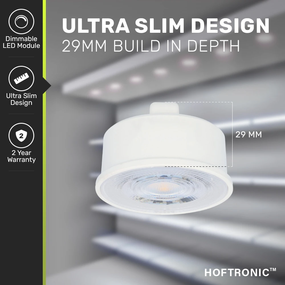 Voor het inbouwen van nieuwe spots in een plafond is er niet altijd even genoeg ruimte over om de lichtbron te vertrekken. Deze LED module heeft een inbouwdiepte van slechts 29mm! Hierdoor kan deze module op handig iedere plek worden geïnstalleerd. Denk hierbij aan verlaagde plafonds, slaapkamers, woonkamers of in de keuken.