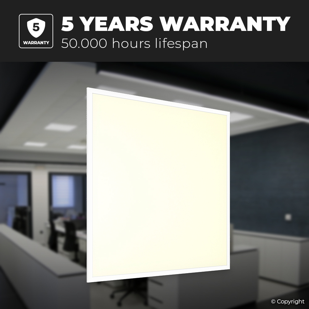 Het LED paneel is perfect flikkervrij. Dit maakt de verlichting bekwaam voor kantoren, werkplaatsen en magazijnen. Het LED paneel verbruikt slechts 36 Watt en verwezenlijkt hiermee 4320 lumen aan licht met een 3000K warm witte lichtkleur. Een efficiëntie van 120 Lumen per Watt. Dit LED paneel heeft een levensduur van 50.000 branduren – bij gemiddeld gebruik komt dit neer op minimaal 20 jaar. Op dit LED paneel ontvang je 5 jaar garantie.