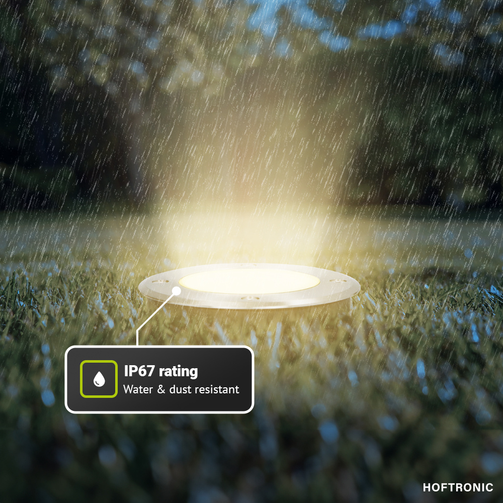 De Lilly grondspot is vol IP67 waterdicht en stofdicht. Hierdoor kun je de grondspots gerust het hele jaar buiten laten, behalve dat je je druk hoeft te maken over eventuele defecten door regen, sneeuw en ijzel. Ze zijn dus bestand tegen de strengste weersomstandigheden maar niet lekker voor beneden water.