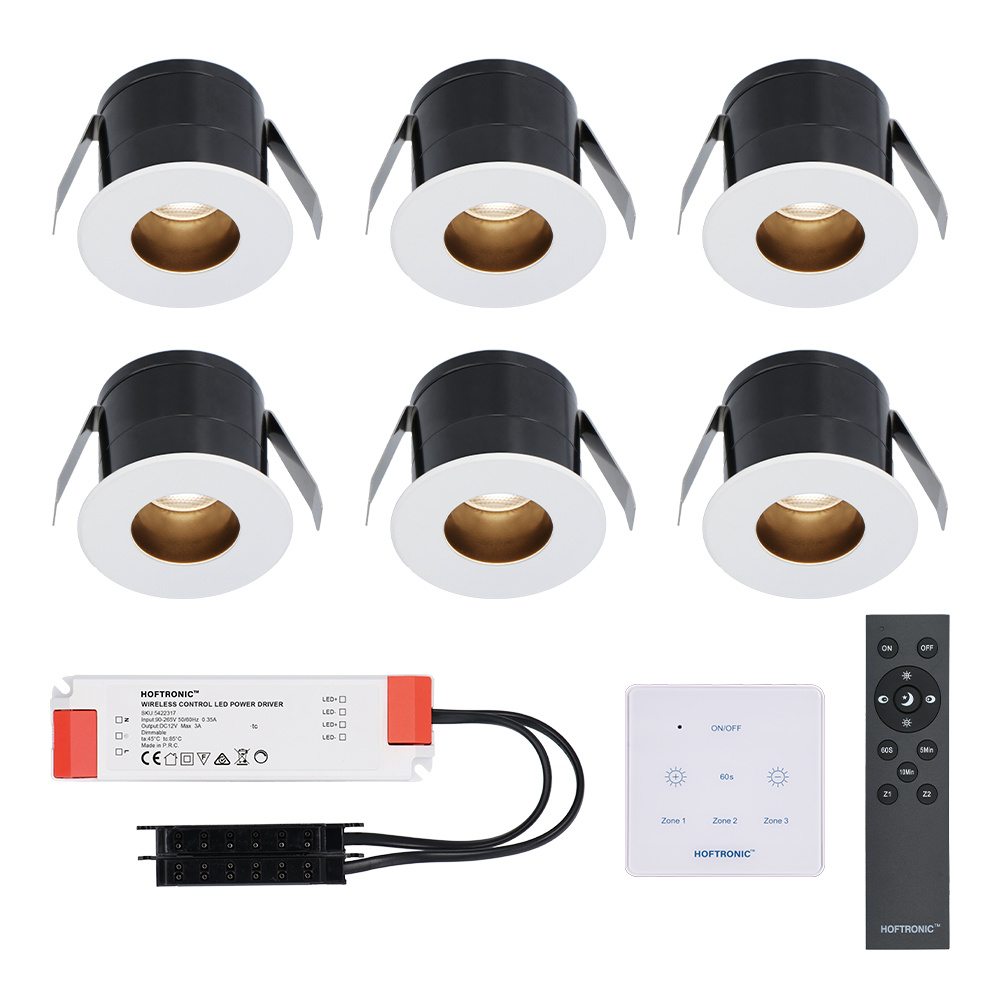 De Hoftronic Olivia dimbare inbouwspot zijn traploos dimbaar, wat betekent dat je in een vloeiende overgang van 100% naar 0% kunt dimmen, en omgekeerd. De kleurtemperatuur is 2700K, wat staat voor warm wit licht. Er wordt een afstandsbediening bij overgedragen. Zit je gemakkelijk in je luie stoel op de veranda, of lig je languit in bad en denk je: de verlichting staat toch iets te fel? Met de afstandsbediening dim je de verlichting direct, en hoef je dus niet op te staan. Ideaal.