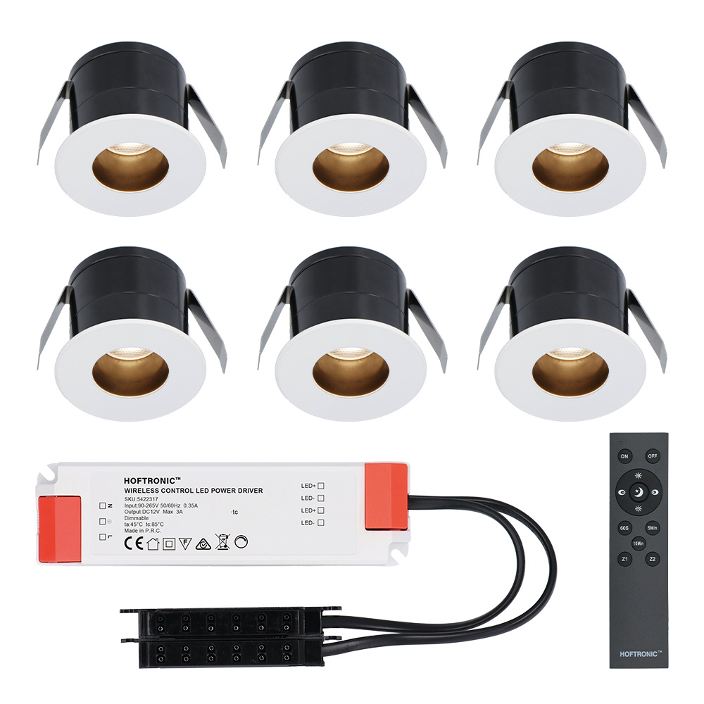 De Hoftronic Olivia dimbare inbouwspot zijn traploos dimbaar, wat betekent dat je in een vloeiende overgang van 100% naar 0% kunt dimmen, en rond gedraaid. De kleurtemperatuur is 2700K, wat staat voor warm wit licht. Er wordt een afstandsbediening bij geleverd. Zit je lekker in je luie stoel op de erker, of lig je languit in bad en denk je: de verlichting staat toch iets te fel? Met de afstandsbediening dim je de verlichting direct, en hoef je dus niet op te staan. Ideaal.