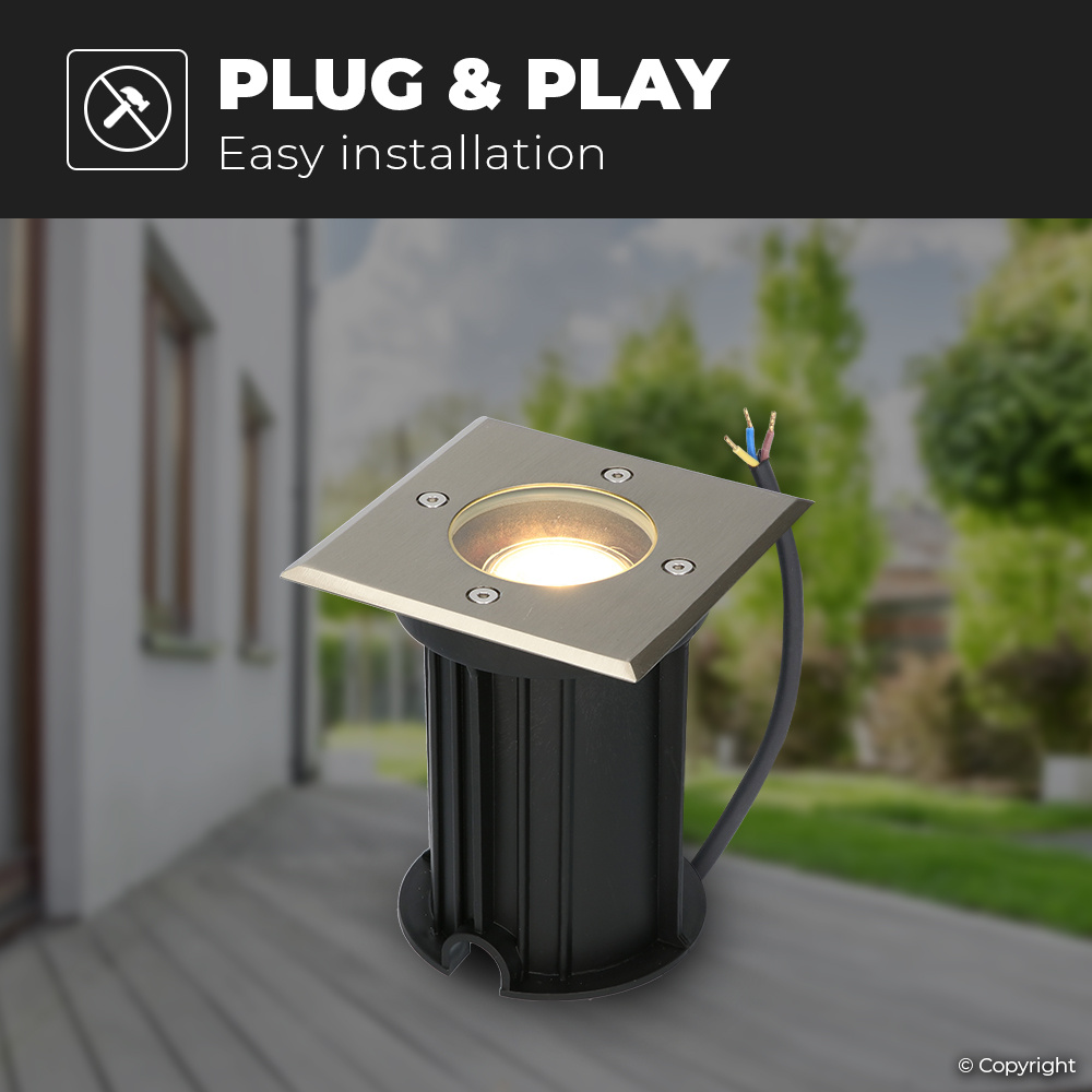 Heb je weinig bedrevenheid met het installeren van verlichting of grondspots? Dan hoef je je geen oppassen te maken: de montage is heel simpel. De spot is al voorzien van een GU10 fitting en is reeds aangesloten op een kabel van 30 cm lang. De spot zelf heeft een formaat van 120 x 142 x 103 millimeter.