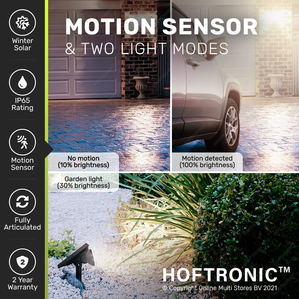 Door de bewegingssensor gaat de lamp automatisch feller branden wanneer de tuinspot beweging detecteert. Ideaal voor ruimtes waar je geen constante felle belichting nodig hebt. Denk hierbij aan je schuur of tuinpad. De PIR bewegingssensor heeft een bereik tot aan 8 meter. Dit betekent dat bewegingen tot een afstand van 8 meter ervoor waken dat de lamp feller gaat branden. Detecteert de tuinspot geen beweging? Dan brandt deze met een zacht licht verder. Door de schemerschakelaar uiteraard alleen wanneer het onverlicht geniet is. De bewegingssensor werkt wanneer de lamp in beide lichtstanden staat.