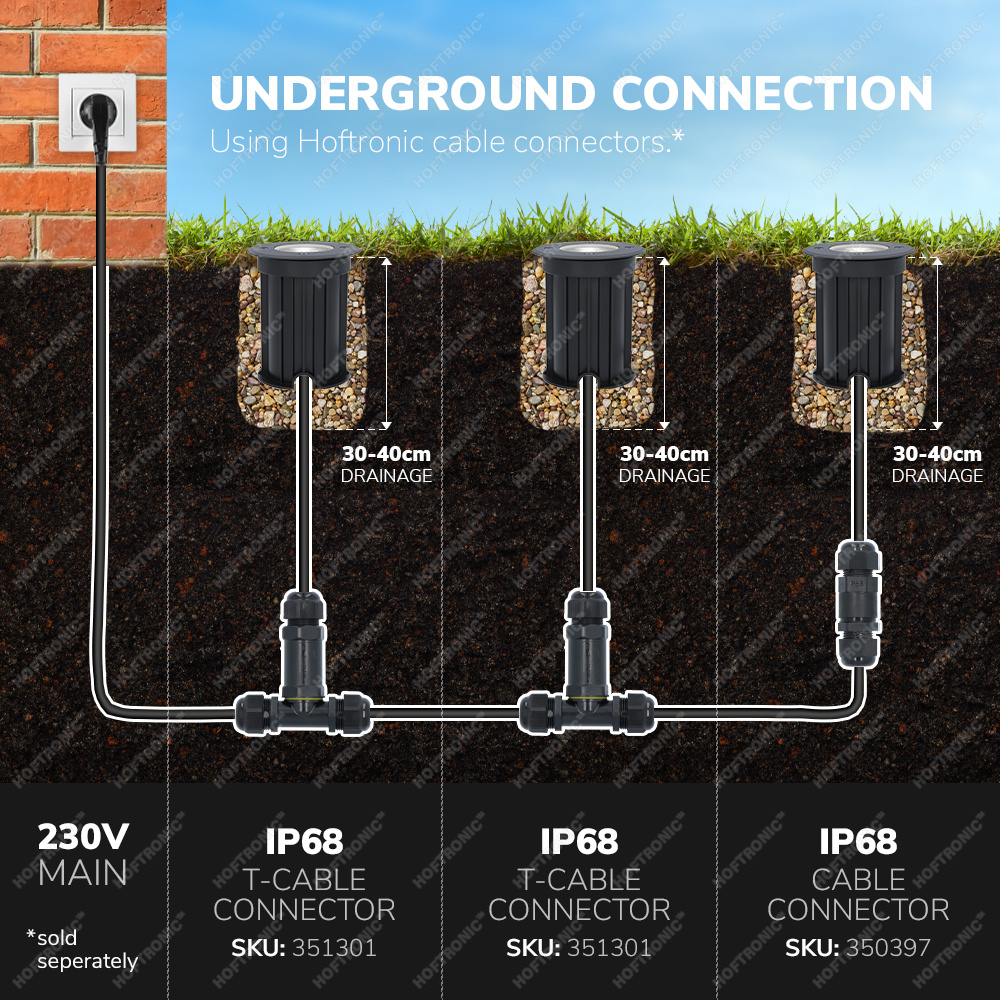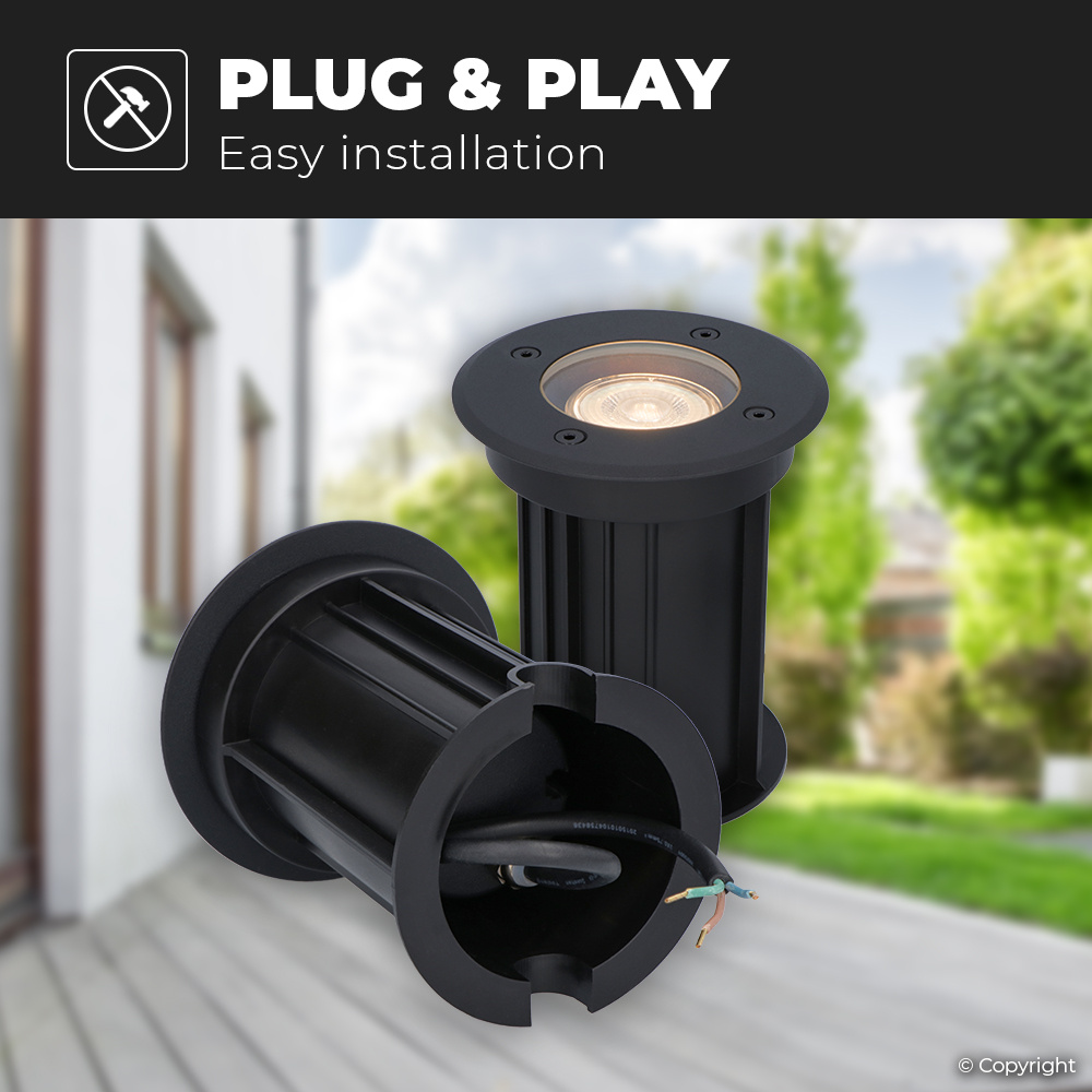 • Eenvoudige montage: Het installeren van de grondspots is heel aangenaam. Deze kunnen regelrecht op het 230V lichtnet worden aangesloten en door middel van waterdichte kabelverbinders aan elkaar worden gekoppeld (Let op deze zijn niet inbegrepen)
