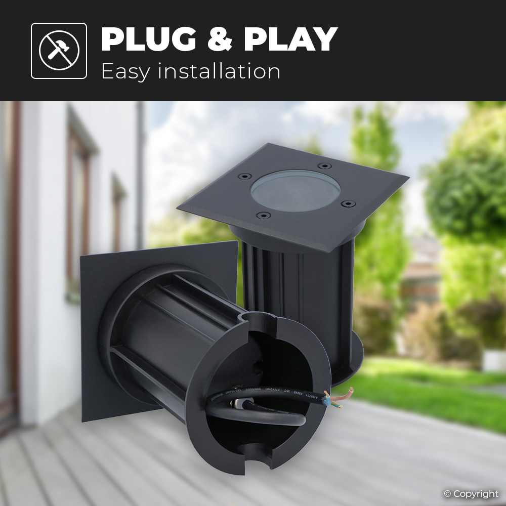 Heb je weinig expertise met het installeren van verlichting of grondspots? Dan hoef je je geen oppassen te maken: de montage is heel eenvoudig. De spot is al voorzien van een GU10 fitting en is reeds aangesloten op een kabel van 30 cm lang. De spot zelf heeft een afmeting van 120 x 142 x 103 mm.