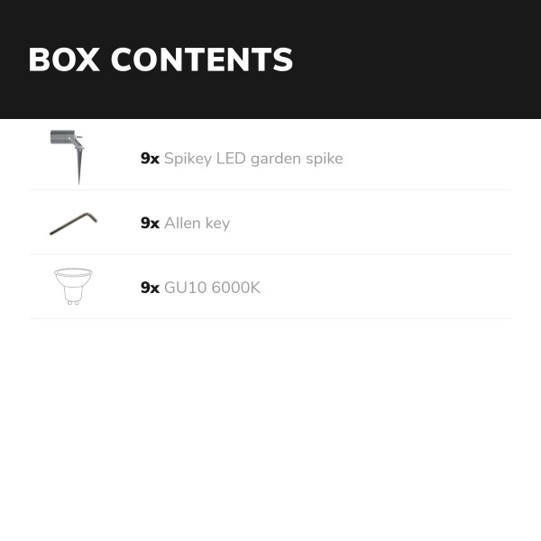 Je tuin voorzien van sfeer en ogenblikkelijk de belangrijkste plekken highlighten? Dan kies je voor deze totale set Spikey tuinspots. De prikspots zijn vol ontworpen van onderhoudsvrij en UV-bestendig gegoten aluminium. De spots zijn voorzien van een GU10 fitting, waardoor je de lichtbron aangenaam kunt vervangen. Spikey heeft geen last van kou, hitte of nattigheid door zijn hoge IP65 beschermingsklasse. Hierdoor kun je de Spikey gerust het hele jaar buiten laten staan/hangen.