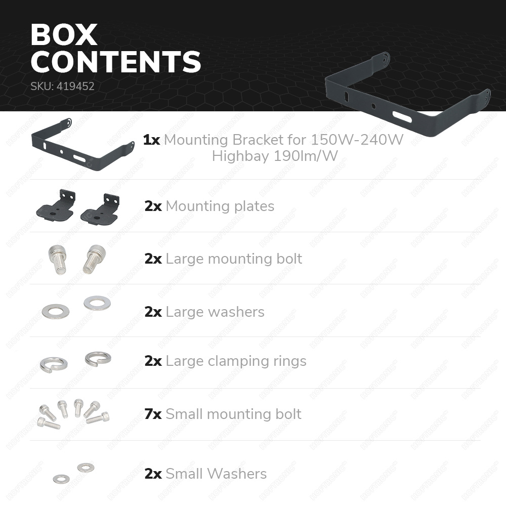 Door de precieze maten van de bevestigingsbeugel is deze alleen goed voor de 150-240W Saturn High Bay. Lengte: 238 millimeter, breedte 35 mm en hoogte 183 mm.