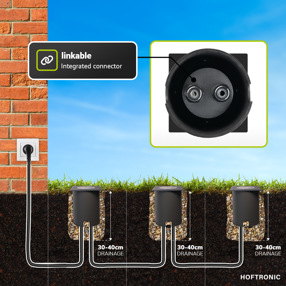 Heb je weinig ervaring met het installeren van verlichting of grondspots? Dan hoef je je geen zorgen te maken: de montage is heel eenvoudig. De spot zelf heeft een afmetingen van 120 x 142 x 103 mm. Je hebt hier tevens geen transformator voor nodig. Het aansluiten van de tuinspots is nu een fluitje van een cent! De kabel die je kunt benuttigen bij het aansluiten is onze Xtrem kabel bijzonder voor onder de aarde. Let er wel op dat je de grondspot altijd in een drainerende ondergrond plaatst.