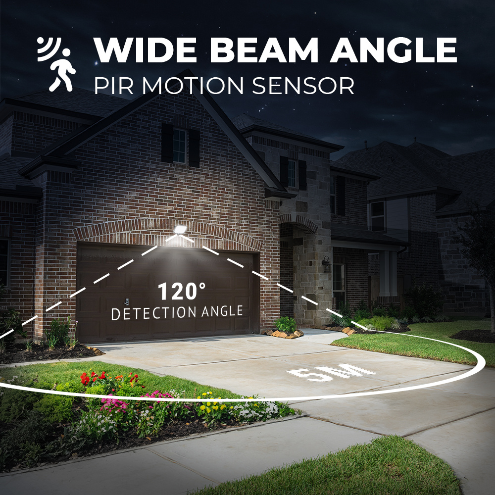 Voor een maximaal detectiebereik monteer je de lamp 1,8 tot 2,5 m boven het te verlichten gebied. Houd er bij het regelen van de plaats van de lamp rekening mee dat de bewegingssensor een gezichtsveld heeft van ultiem 120° (horizontaal) met een maximale afstand van 5 meter bij een omgevingstemperatuur van 25°C.