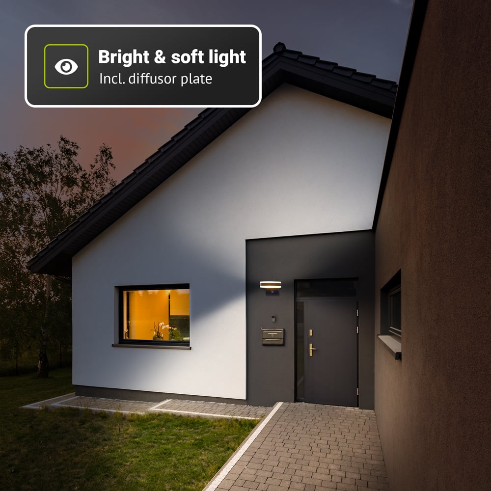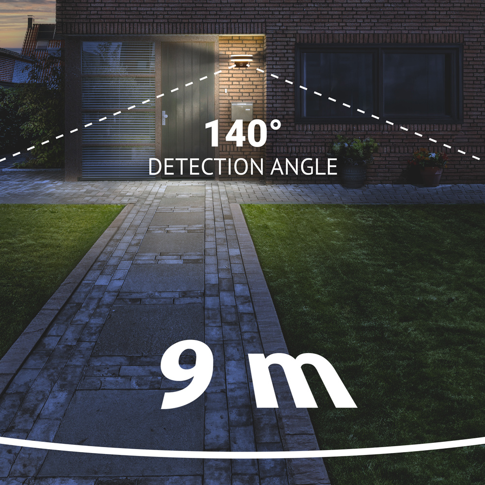 Door de IP65-waterdichtheid kun je de lamp met een gerust hart het hele jaar door buiten laten hangen, zelfs als het regent of sneeuwt. Het is een ideale sensor-lamp om bij de voordeur, de toegang of aan weerzijden van de garagepoort te hangen. Daarnaast kun je hem mede als wandlamp gebruiken bij het looppad langs een schuur, aan de schutting in je tuin en nog veel meer.