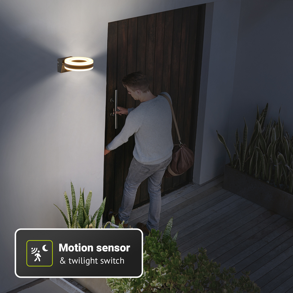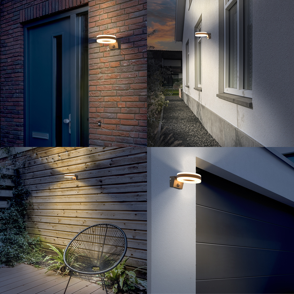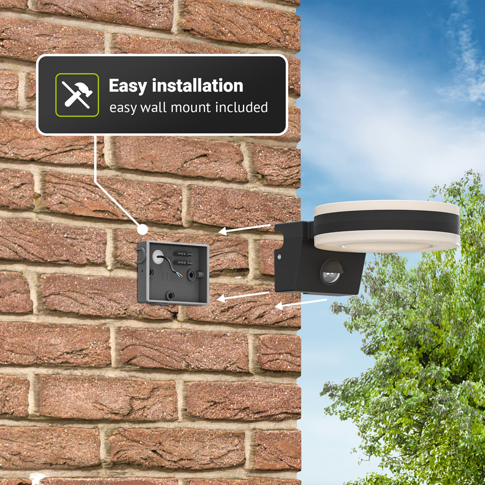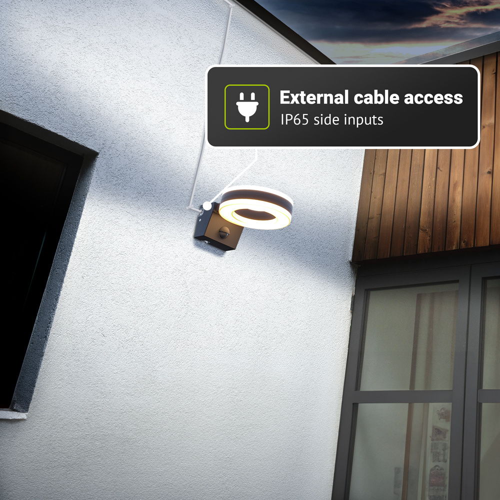 De Corby LED wandlamp met bewegingssensor en schemersensor is een toffe, functionele wandlamp met een lichtsterkte van maar liefst 1600 lumen die je op diverse vertrekken kunt monteren. Het ontwerp van de lamp is een ring die zowel naar onder als naar boven licht schijnt. Door de ingebouwde bewegingssensor en schemersensor schakelt de lamp automatisch aan wanneer het ‘s avonds donkerder wordt of wanneer de sensor een beweging detecteert. Het schemer-inschakelniveau en de tijdruimte zijn hierbij naar wens in te stellen. De wandlamp met sensor geeft veel licht om een plek bijv. je oprit op carport optimaal te verlichten. Dankzij de LED-technologie verbruikt de lamp slechts 20 watt, wat niet alleen extreem is voor het biotoop maar ook voor je portemonnee! De LED wandlamp met sensor geeft de wandlamp een warm wit licht van 3000K. Door de IP65-beschermingsklasse is de lamp waterdicht en kun je hem het hele jaar door buiten laten hangen, zelfs in regen sneeuw.