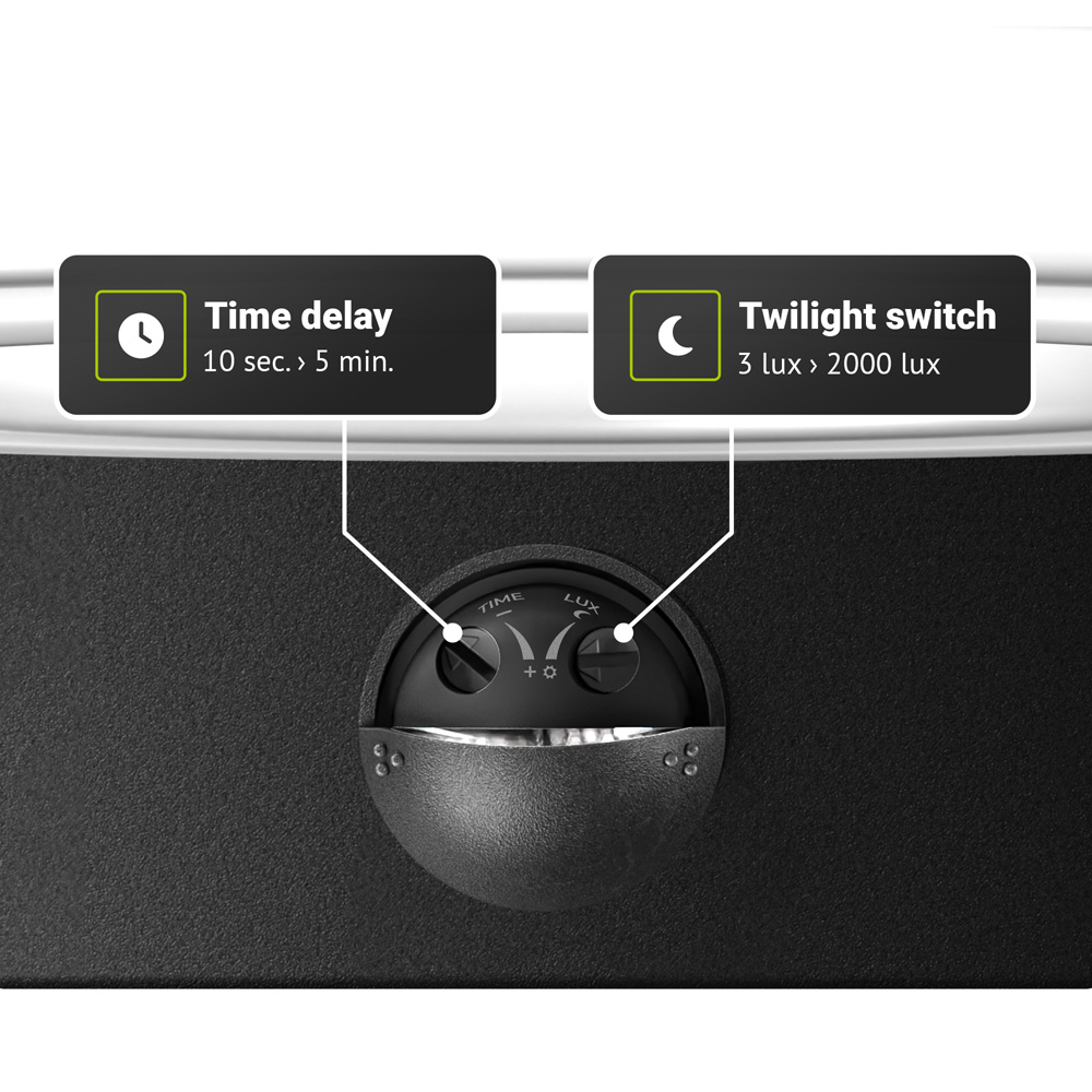 De Corby LED sensor wandlamp heeft zowel een bewegingssensor als een schemerschakelaar. Hierdoor reageert de lamp wanneer het ’s avonds donkerder wordt, maar zal hij tevens aanschakelen wanneer hij beweging detecteert (tot optimaal 9 meter). De schemerschakelaar en de tijdsduur zijn beide in te stellen via de knopjes die onder het kapje van de sensor zetten. Schuif het kapje naar onderen om bij de instel-knoppen te komen. Met de schemerschakelaar kun je het aantal lux instellen. Wanneer je het aantal lux heel goedkoop instelt, schakelt de sensor de lamp in wanneer het buiten zeer donkerkleurig is (3 lux). Draai je de knop honderd procent naar de zon? Dan zet de sensor de lamp aan wanneer het nog vrij licht is (> 300 lux) zal de lamp bij de minste schemering onmiddelijk aanspringen. Tot slot kun je tevens instellen hoelang de lamp blijft branden nadat hij geen beweging meer heeft gedetecteerd. Hierdoor bespaar je geld en vitaliteit doordien de wandlamp niet onnodig lang blijft branden.