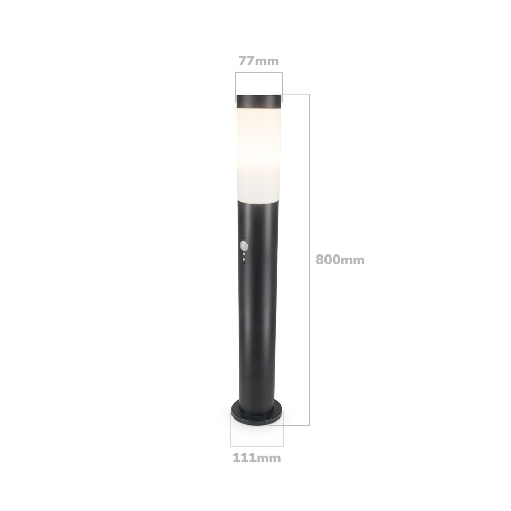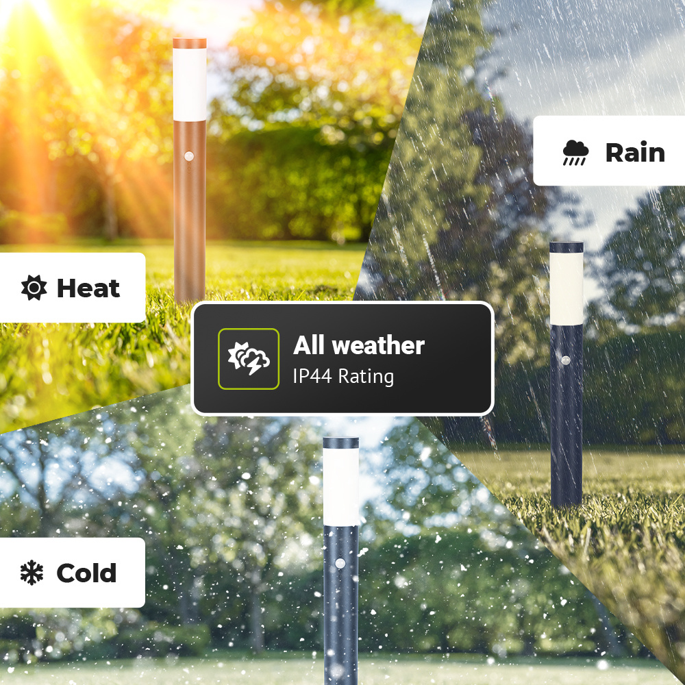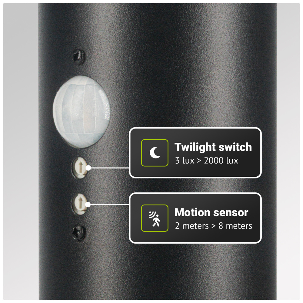 Door de bewegingssensor gaat de lamp automatisch aan wanneer de sokkellamp beweging detecteert binnen een afstand van 2 tot maximaal 8 meter. Ideaal voor plekken waar je geen constante belichting nodig hebt. Denk hierbij aan je tuinpad. De sokkellamp heeft bovendien een schemerschakelaar. Deze is in te stellen tussen 2 en 200 Lux omgevingslicht. Het is niet mogelijk om de bewegingssensor en schemerschakelaar apart van elkaar te bedienen. De bewegingssensor is altijd vitaal en hierdoor werkt de schemerschakelaar enkel op de bewegingssensor. De schemerschakelaar werkt dus niet los.