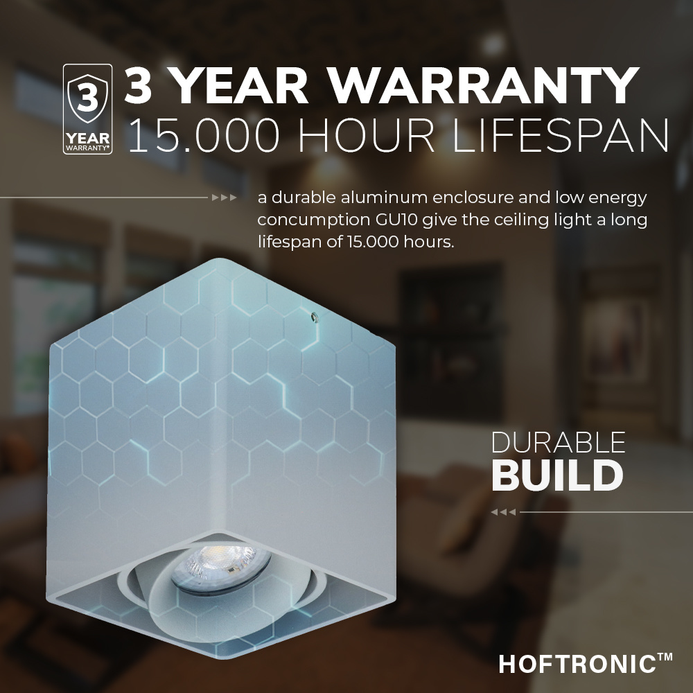 De Esto opbouw plafondspot is in van hoge kwaliteit aluminium gefinaliseerd en wordt standaard geleverd met afdekringen en GU10 spot met lichtkleur 4000K. Je hebt drie jaar garantie op het armatuur.
