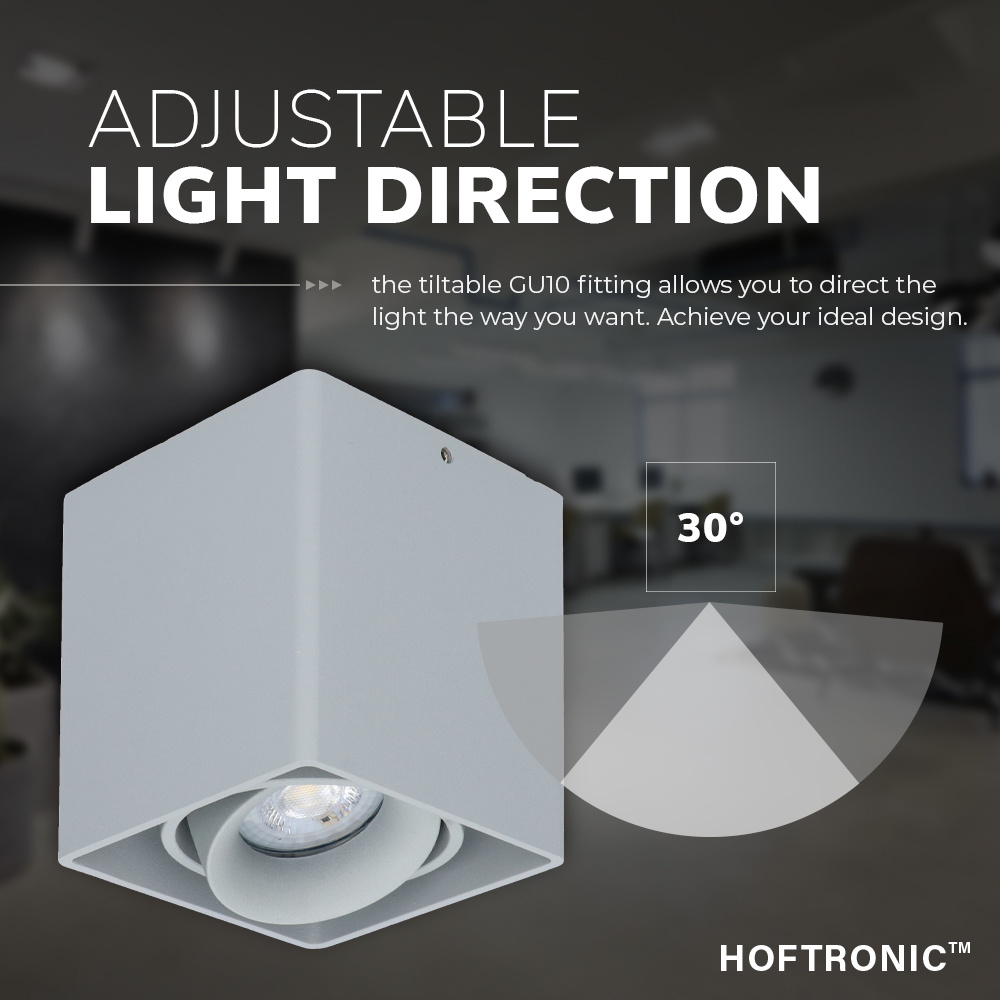 De Esto wordt normaal bezorgd met een GU10 spots. Deze is comfortabel te vervangen en dat heeft twee voordelen. Ten eerste kun je na aankoop alsmaar nog switchen van lichttemperatuur. Zo maak je van een nuttige opbouwspot moeiteloos sfeerverlichting en andersom. Ten tweede wordt de levensduur van de lamp verlengd, omdat je geen gloednieuwe opbouwspot hoeft aan te schaffen zodra de lichtbron het begeven heeft.