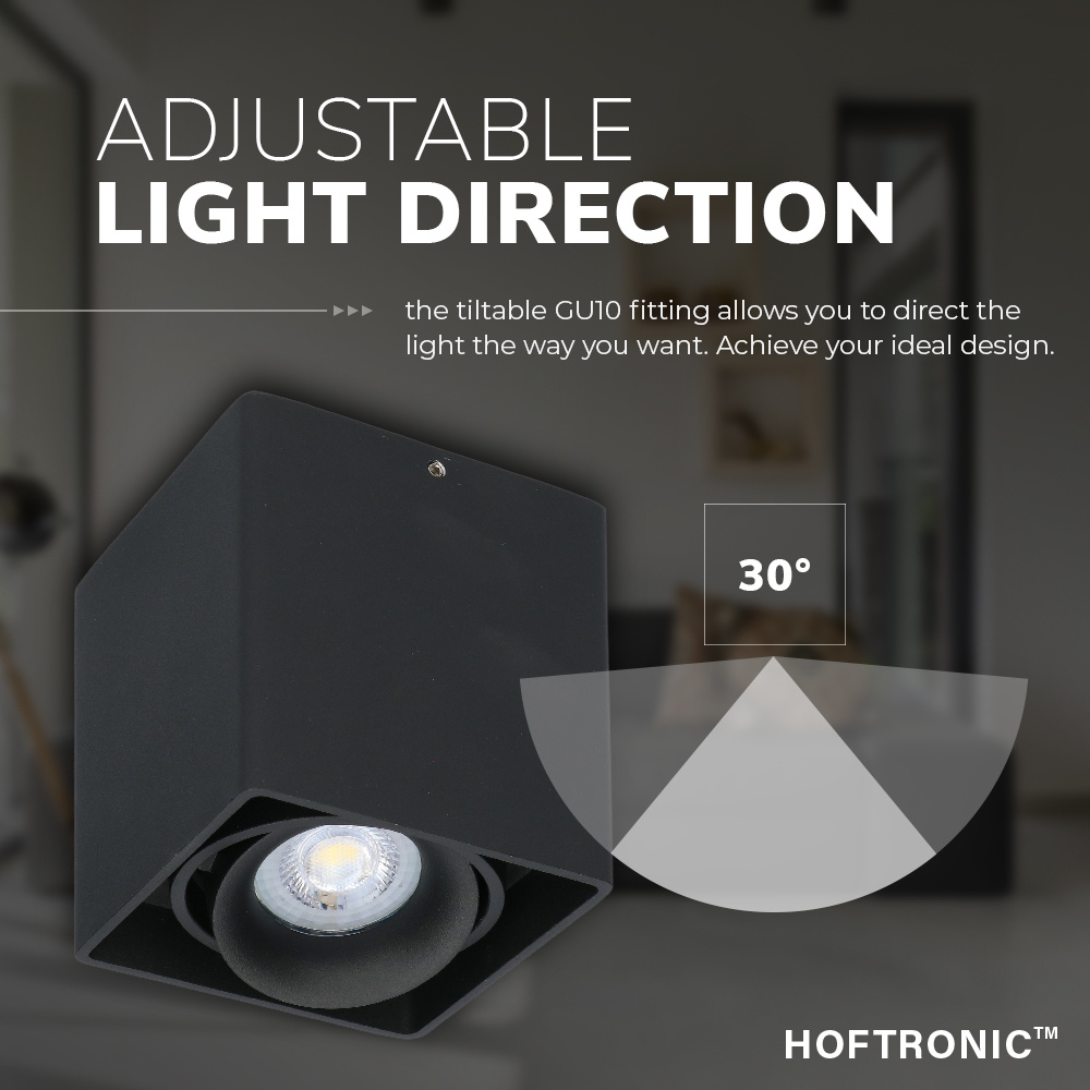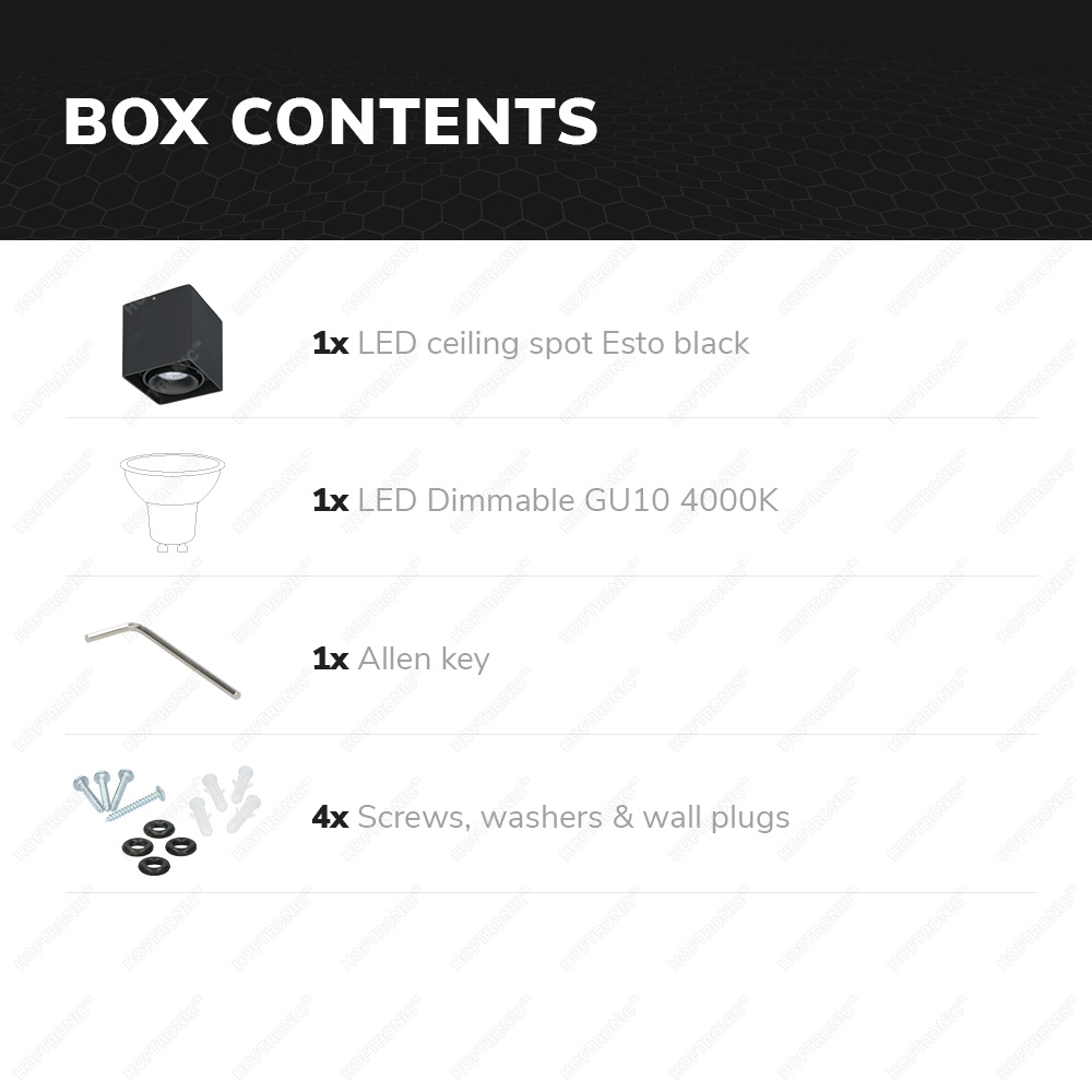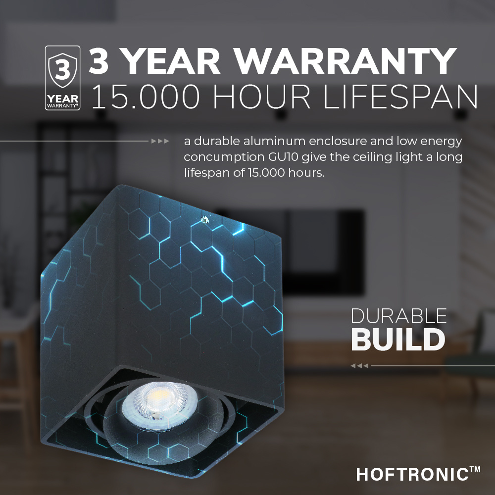 Er wordt standaard een GU10 spot van Hoftronic bijgeleverd. Deze is heel eenvoudig te verwisselen en dat heeft twee voordelen. Ten eerste kun je na aankoop aanhoudend nog switchen van lichttemperatuur. Zo maak je van een praktische opbouwspot eenvoudig sfeerverlichting en andersom. Ten tweede wordt de levensduur van de lamp verlengd, doordien je geen nieuwe opbouwspot hoeft aan te schaffen zodra de lichtbron het begeven heeft.