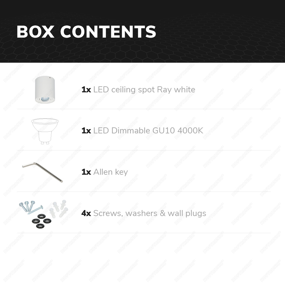 De Ray wordt normaal geleverd met een GU10 spots. Deze is simpelweg te afwisselen en dat heeft twee voordelen. Ten eerste kun je na aanschaf altijd nog switchen van lichttemperatuur. Zo maak je van een functionele opbouwspot simpelweg sfeerverlichting en andersom. Ten tweede wordt de levensduur van de lamp verlengd, doordien je geen kersverse opbouwspot hoeft aan te schaffen zodra de lichtbron het begeven heeft.