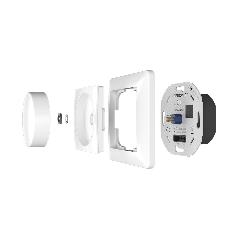 Complete afdekmateriaal in de kleurschakering wit betrouwbaar voor de ECO-DIM.04, DM175 en ECO-DIM.01 en dimmers van HOFTRONIC met product nummer: 2714154, 5435911 en 5435898