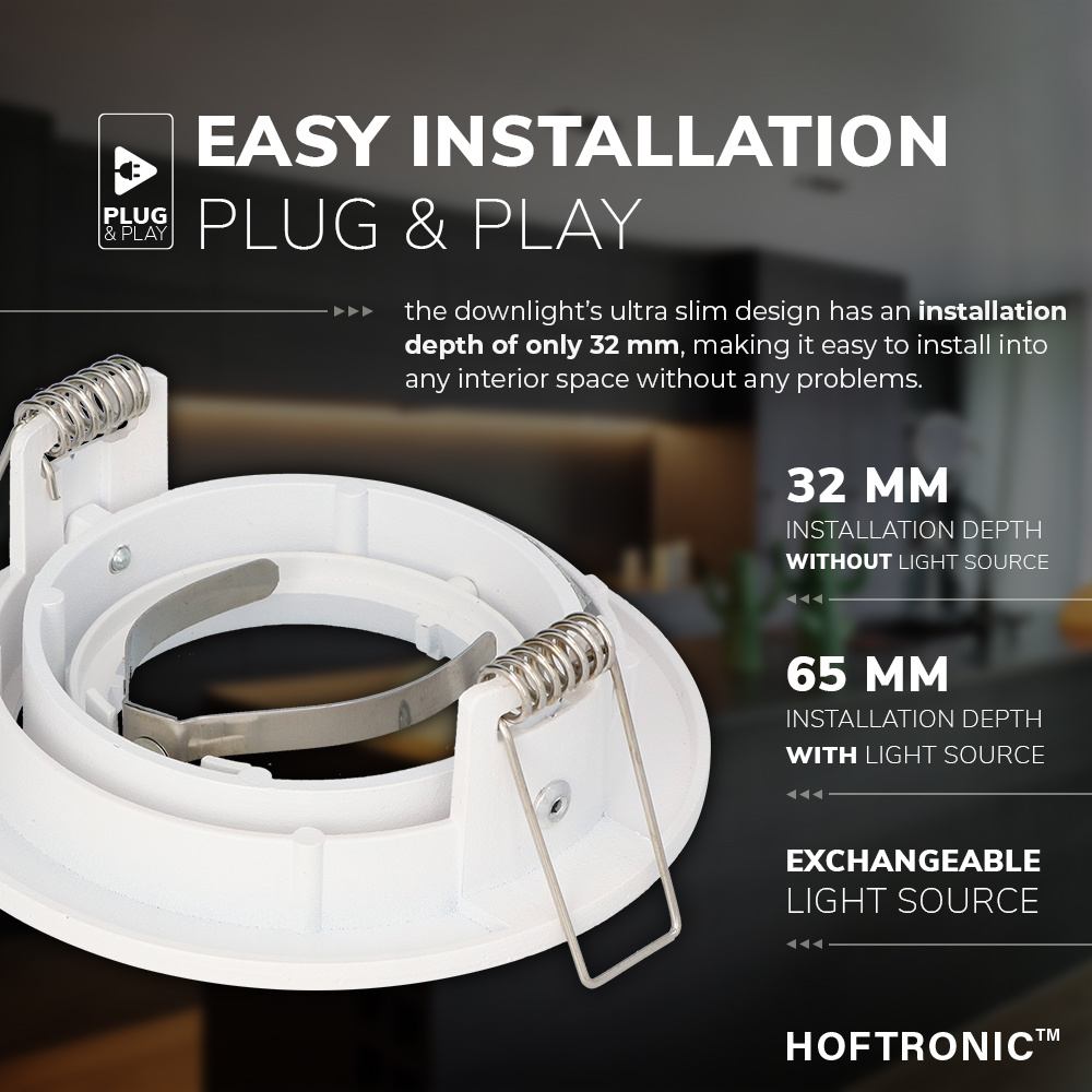 De Dublin armatuur is bekwaam als inbouwspot voor je plafondverlichting. Door de handige GU10 fitting draai je handig en vlug elke lichtkleur GU10 lamp in je inbouwspot. Het armatuur is ontworpen van een sterk en behoorlijk onderhoudsvrij aluminium.