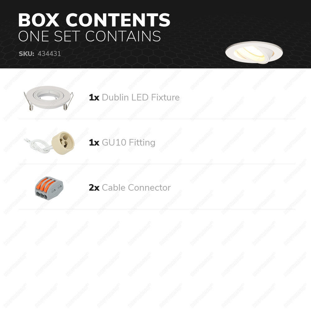 De Dublin inbouwspot wordt volledig geleverd. Dit zorgt ervoor dat je op de dag dat je het pakketje binnen krijgt onmiddelijk aan de slag kunt met de installatie. In de verpakking vind je de volgende items: