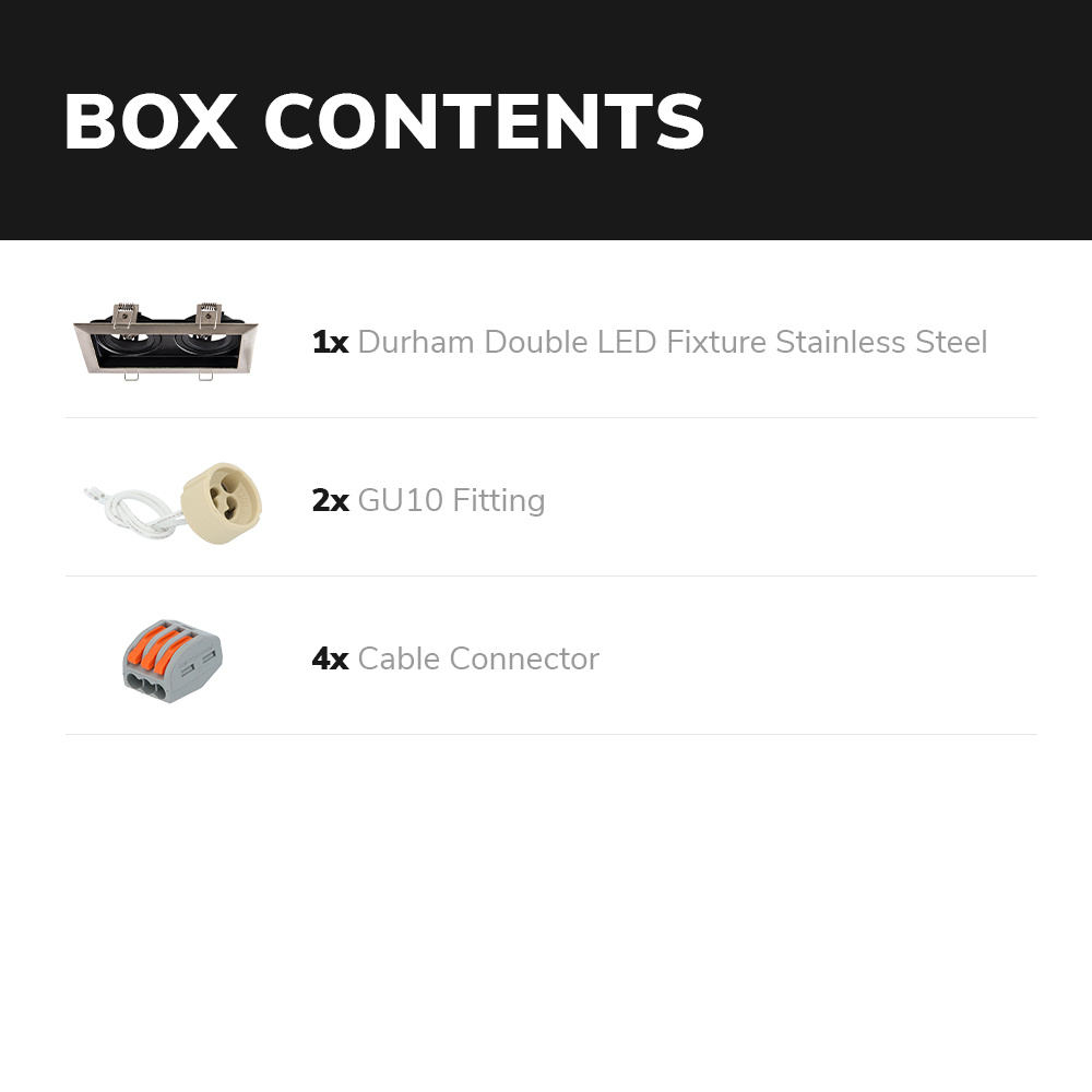 De Durham Dubbel RVS is een inbouwspot met 2 GU10 fittingen. De armatuur is bekwaam als inbouwspot voor je plafondverlichting. Door de handige GU10 fitting draai je moeiteloos en gauw elke lichtkleur GU10 lamp in je inbouwspot. Het armatuur is gecreëerd van een stevig en stevig onderhoudsvrij aluminium.