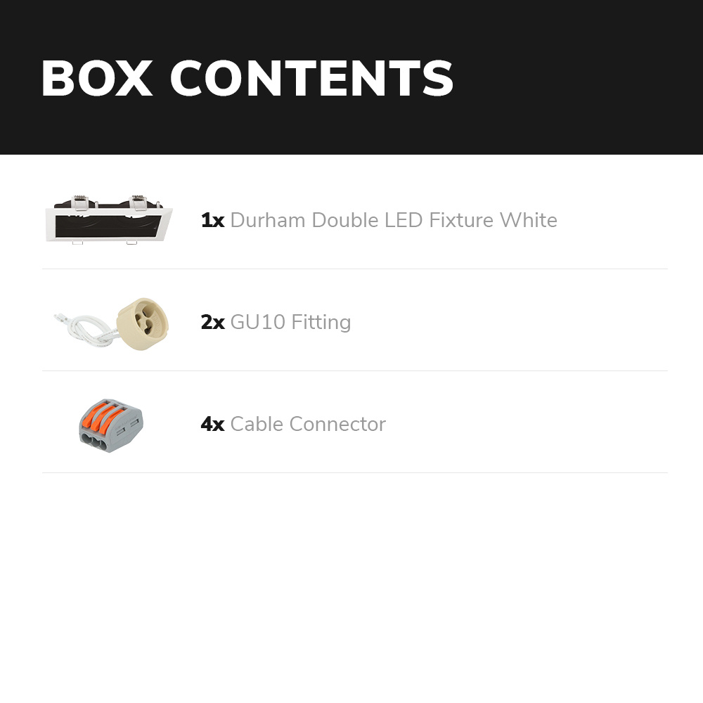 De Durham Dubbel Wit is een inbouwspot met 2 GU10 fittingen. De armatuur is betrouwbaar als inbouwspot voor je plafondverlichting. Door de handige GU10 fitting draai je comfortabel en gauw elke lichtkleur GU10 lamp in je inbouwspot. Het armatuur is gecreëerd van een stevig en behoorlijk onderhoudsvrij aluminium.