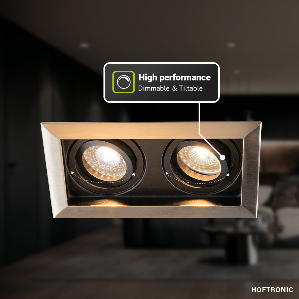 De Durham Dubbel RVS is een inbouwspot met 2 GU10 fittingen. De armatuur is bekwaam als inbouwspot voor je plafondverlichting. Door de handige GU10 fitting draai je moeiteloos en vlug elke lichtkleur GU10 lamp in je inbouwspot. Het armatuur is gebouwd van een behoorlijk en stevig onderhoudsvrij aluminium.