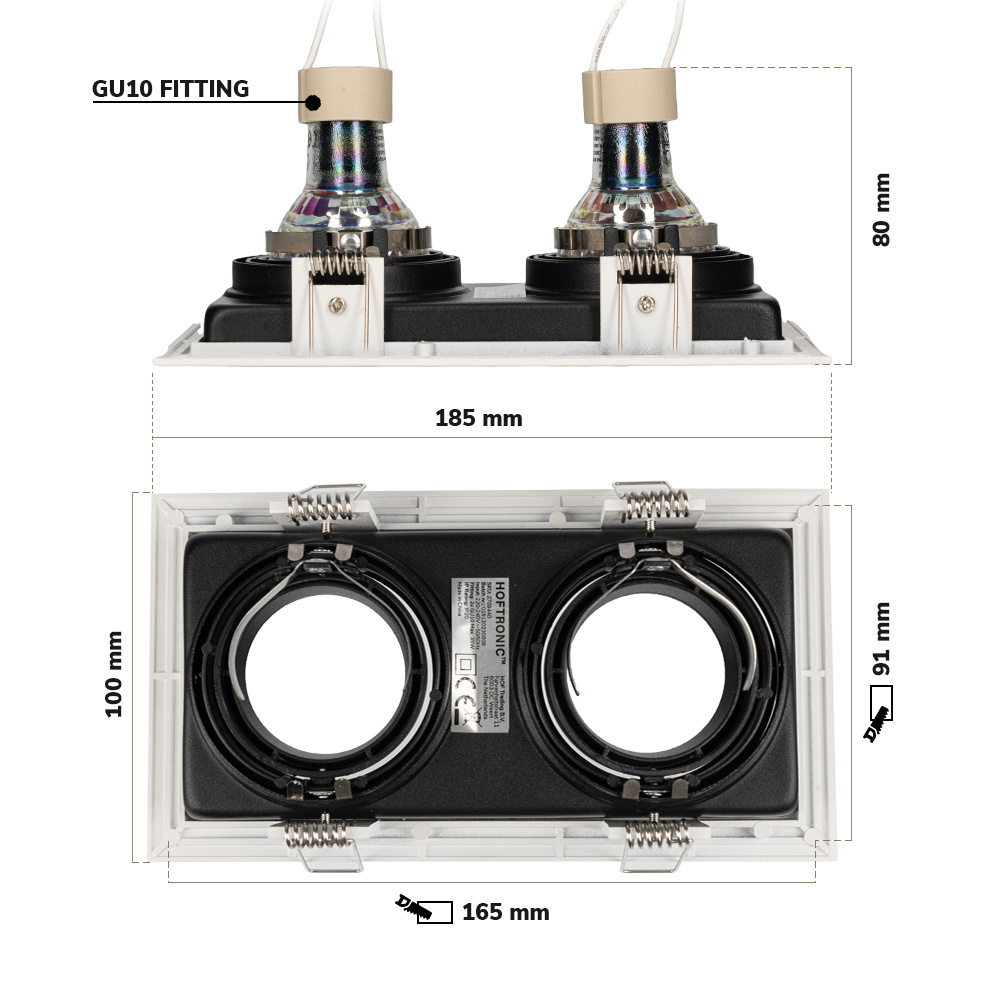 De Durham Dubbel Wit is een inbouwspot met 2 GU10 fittingen. De armatuur is geschikt als inbouwspot voor je plafondverlichting. Door de handige GU10 fitting draai je aangenaam en gauw elke lichtkleur GU10 lamp in je inbouwspot. Het armatuur is gefabriceerd van een grondig en potig onderhoudsvrij aluminium.