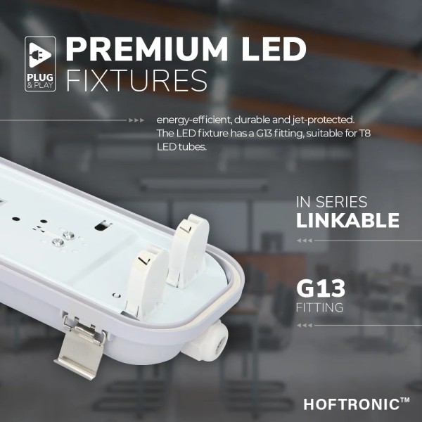 Op zoek naar een high lumen LED TL armatuur van 150cm voor het verlichten van de garage, schuur, werkplaats, fabriekshal of magazijn? Dan kies je voor deze zuinige LED TL lampen van HOFTRONIC. De lampen zijn IP65 waterdicht, bestand tegen chemische dampen en stootvast. Deze LED TL armatuur bezit over een zuinige LED TL buis met een efficiëntie van 200 lumen per Watt. Hierdoor vervangt deze 48 Watt LED TL lamp een 275 Watt TL lamp. Een besparing van maar liefst 85% op je stroomrekening. De LED TL armatuur is volledig flikkervrij en hierdoor ook prima voor zakelijke toepassingen.