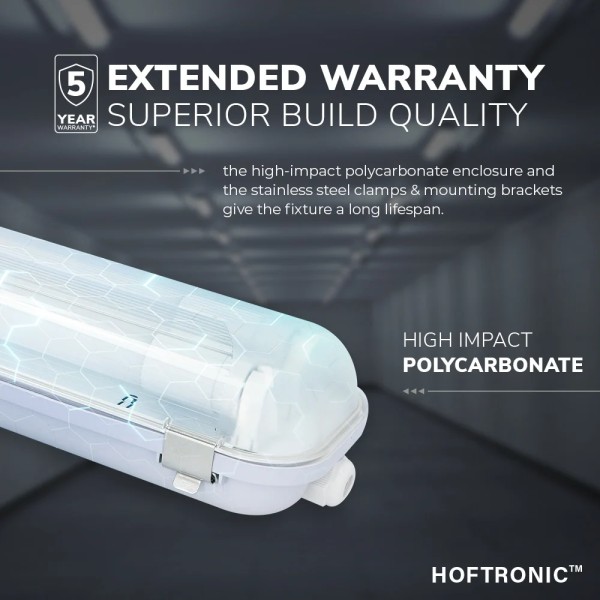 Op zoek naar een high lumen LED TL armatuur van 150cm voor het van licht voorzien van de garage, schuur, werkplaats, fabriekshal of magazijn? Dan kies je voor deze zuinige LED TL lampen van HOFTRONIC. De lampen zijn IP65 waterdicht, bestand tegen chemische dampen en stootvast. Deze LED TL armatuur bezit over een zuinige LED TL buis met een efficiëntie van 200 lumen per Watt. Hierdoor vervangt deze 48 Watt LED TL lamp een 275 Watt TL lamp. Een besparing van maar liefst 85% op je stroomrekening. De LED TL armatuur is compleet flikkervrij en hierdoor mede bekwaam voor zakelijke toepassingen.