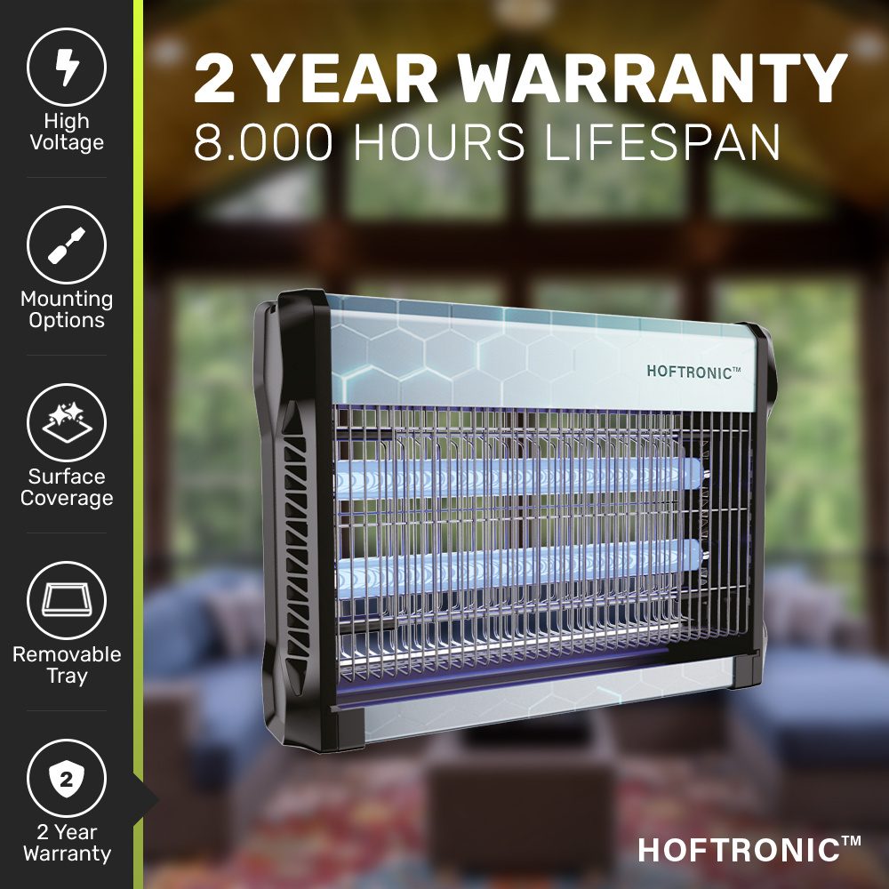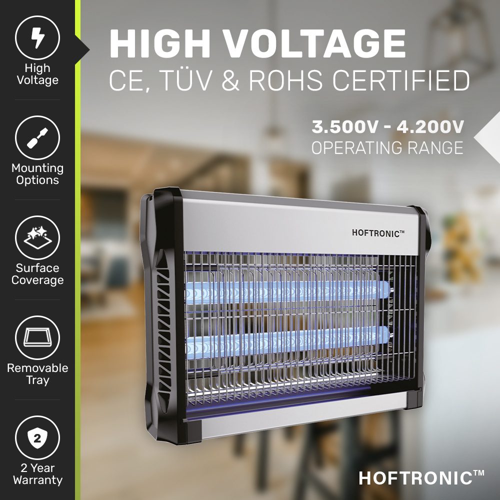 Deze insectenlamp heeft een fraaie prijs- kwaliteitverhouding. Waar de gemiddelde lamp in deze prijsklasse een Voltage levert van circa 2200 Volt levert deze lamp maar liefst 3500-4200 Volt! De buizen zijn omwikkeld met een elektrisch geladen draadgaas onder hoogspanning. Hij is voorzien van duurzame ultraviolet lampen en schijnt een zacht blauw licht wat maakt dat de lamp perfect is voor toepassing in bijvoorbeeld de slaapkamer. Ondanks dat de muggenlamp een zacht licht uitstraalt heeft deze een zeer hoge aantrekkelijkheid op insecten.