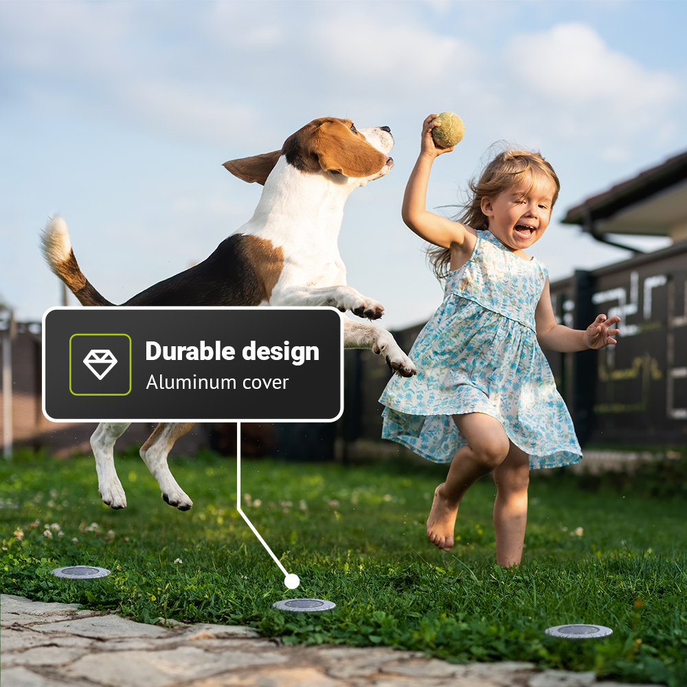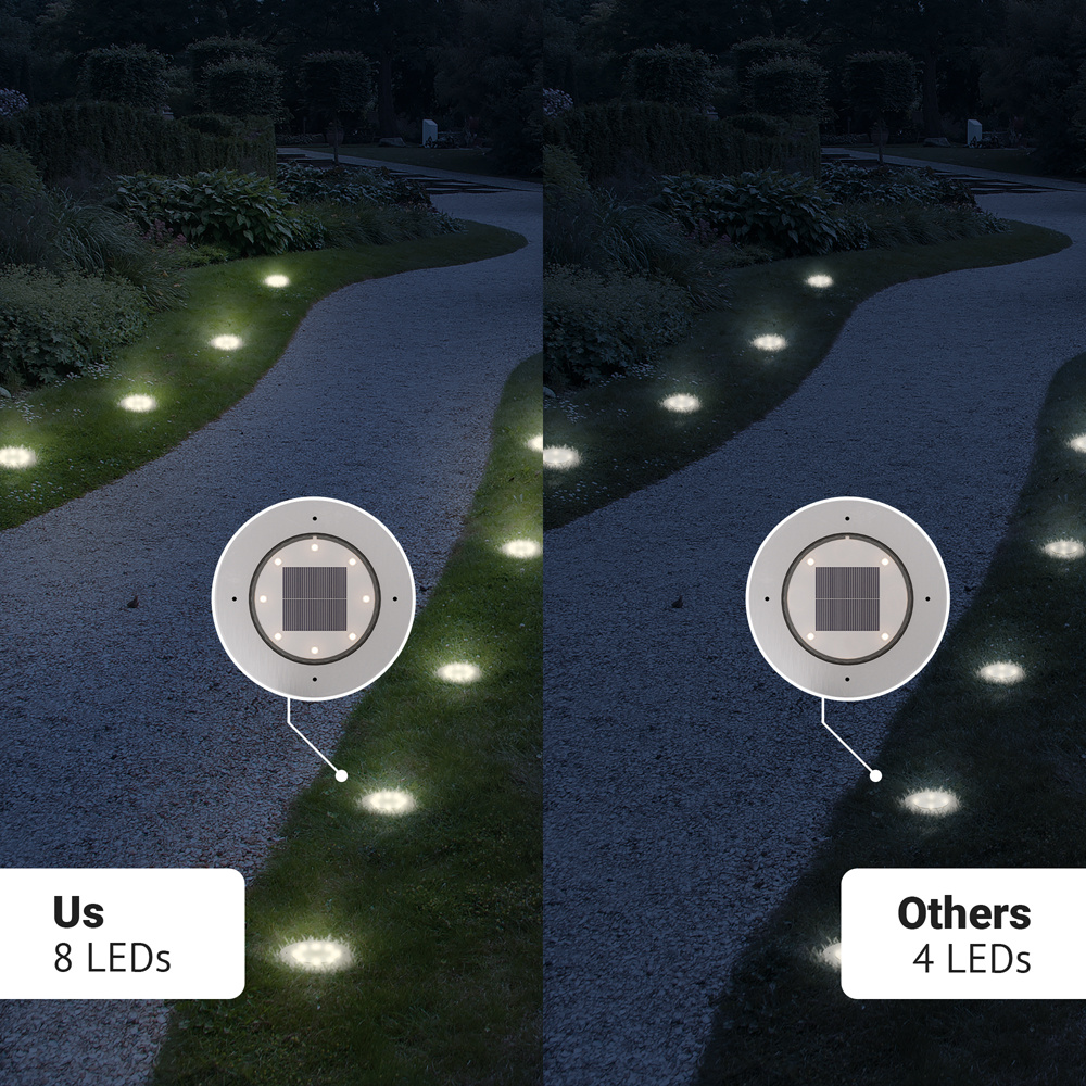 - 8 LED chips: Deze solar grondspots zijn extra fel. De spotjes beschikken namelijk over 8 LED chips. Hierdoor kunnen de grondspots gemakkelijk grotere planten, struiken en bloemperken uitlichten.