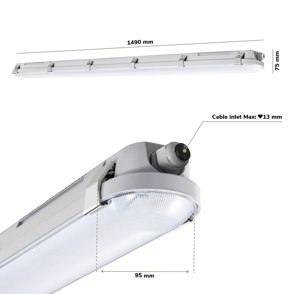 Met de F03 IP66 150cm LED armaturen zijn de toepassingsmogelijkheden zeer groot. De F03 LED armaturen hebben een beschermingsgraad van IP66 en zijn daarmee waterdicht. De F03 IP66 LED armaturen zijn dus niet alleen bekwaam voor droge vertrekken, maar bovendien natte ruimtes. Je kunt ze gerust ophangen in supermarkten, sportfaciliteiten, parkeergarages, tankstations, stationshallen of kantoorgebouwen.