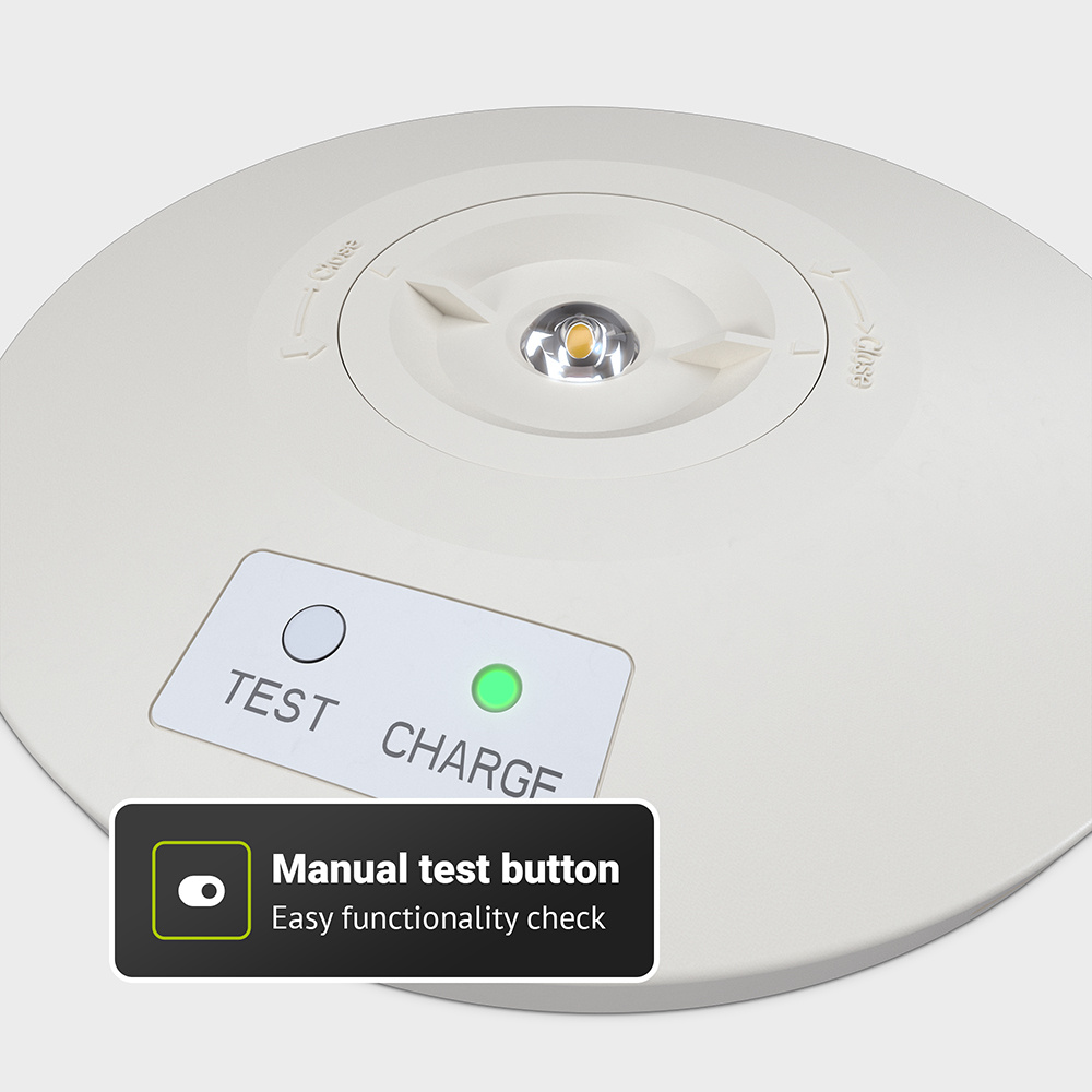 De Fuga opbouwspot heeft een testknop waarmee je handmatig kunt controleren of de noodverlichting automatisch inschakelt bij stroomuitval. Het is verplicht om maandelijks handmatig een functietest en jaarlijks een duurtest van drie uur uit te voeren.