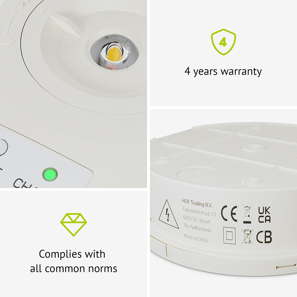Dankzij deze hoogwaardig kwalitatieve LiFePO4 batterij heeft de Fuga een lange levensduur en weinig onderhoud. Daarnaast verbruikt de lamp slechts 1,6 watt waardoor hij zeer energiezuinig is en dus tevens langer meegaat. De behuizing van de Fuga is gefabriceerd van sterk polycarbonaat. Tot slot heeft de lamp > 102000 branduren, waardoor je meerdere jaren lang geen omkijken hebt naar deze lamp. Op deze noodverlichting ontvang je 4 jaar waarborg (2 jaar op de batterij).