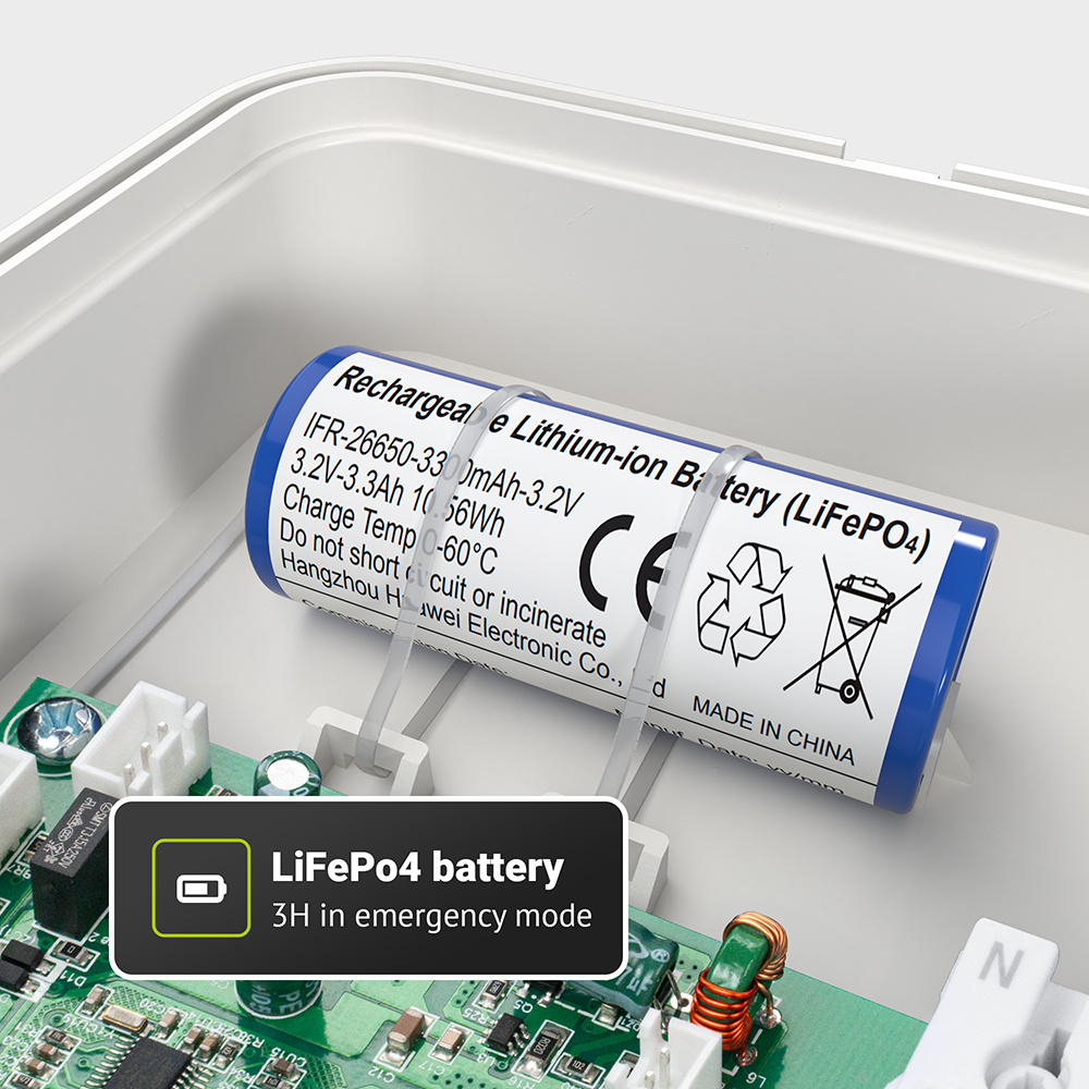 Als de stroom uitvalt en de verlichting niet meer werkt, hoef je je dankzij deze noodverlichting geen zorgen te maken. De Fuga is uitgerust met een propere LiFePO4 3.2V 3300mAh back-up batterij die tot wel 3 uur kan branden. Deze batterij is thuis 24 uren volkomen opgeladen. De noodverlichting schakelt automatisch in wanneer de stroom uitvalt. In gevaarlijke situaties behalve stroom zal de noodverlichting op de batterij blijven werken.